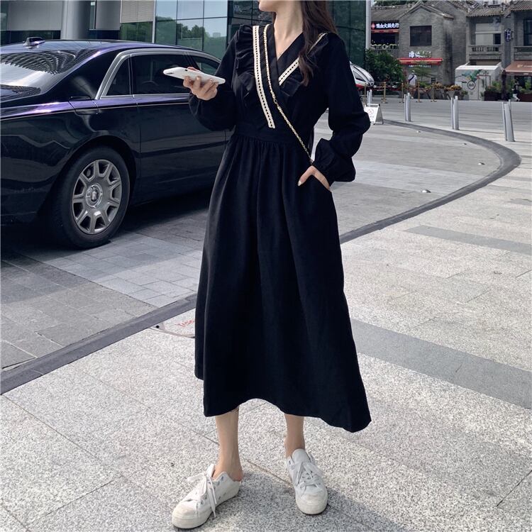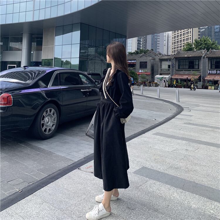 胸元のさりげないフリルがフェミニンなミドル丈ワンピース。
