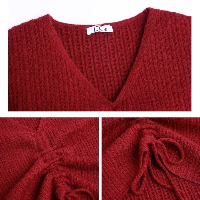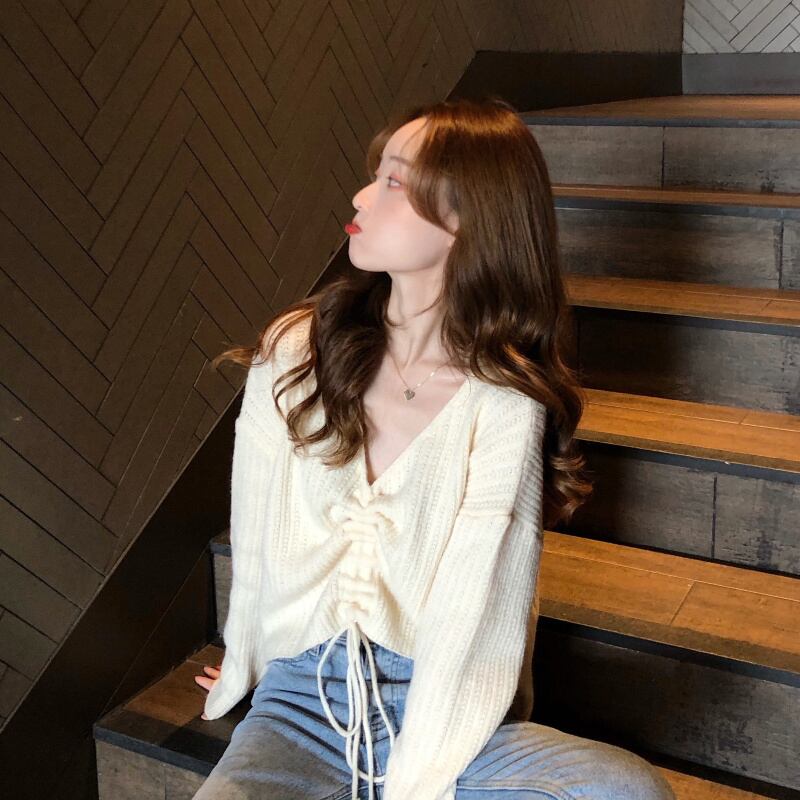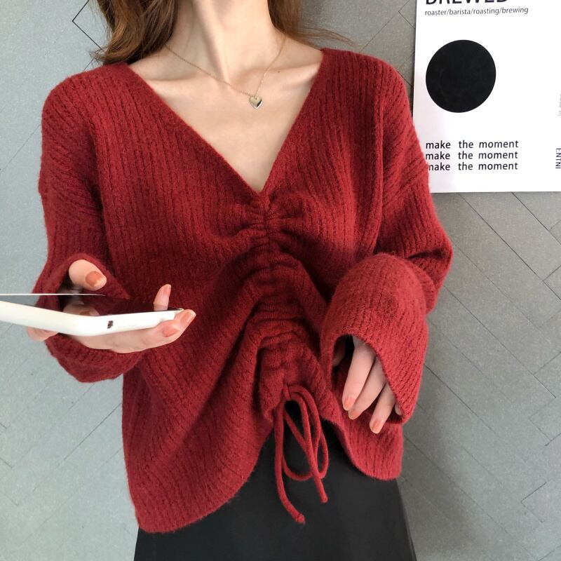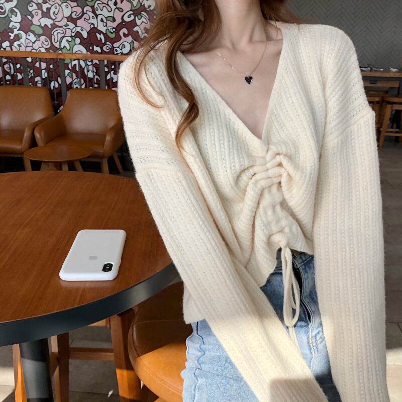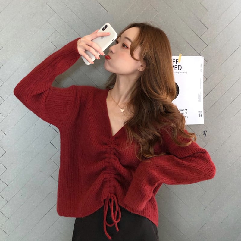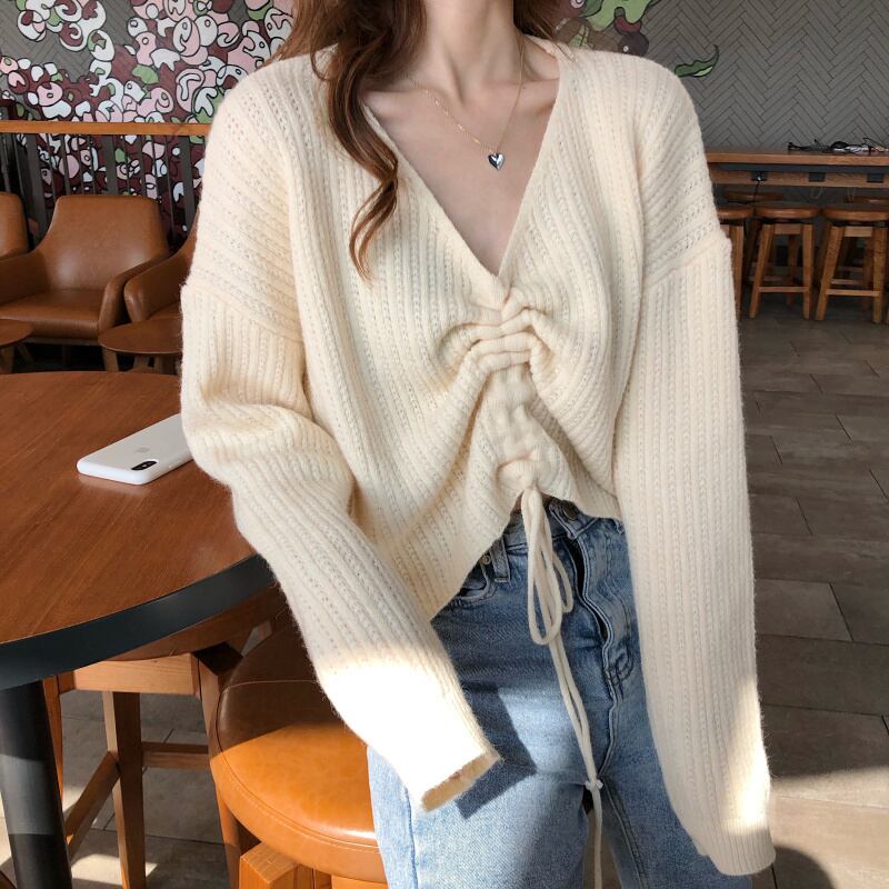 全2色 レディース トップス ニット セーター プルオーバー シャーリング ギャザー リボン ショート丈 Vネック オルチャン ガーリー フェミニン 大人カジュアル ナチュラル 秋 冬 キレナチュ