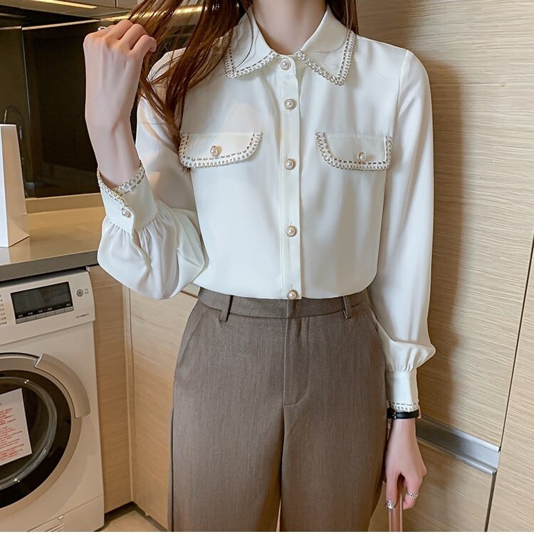 パールボタンがオシャレなシフォンブラウス。