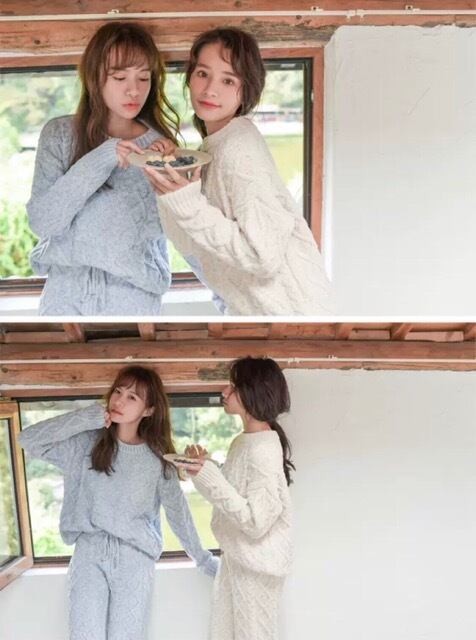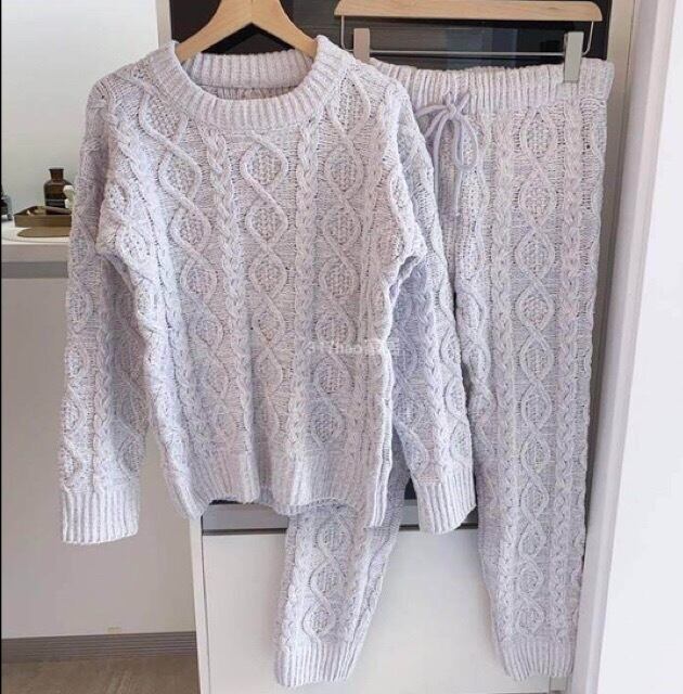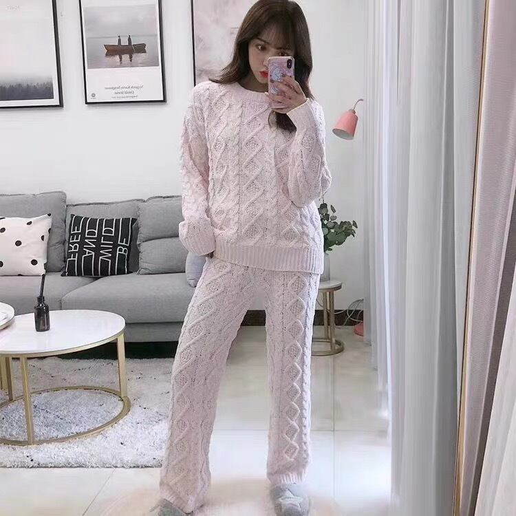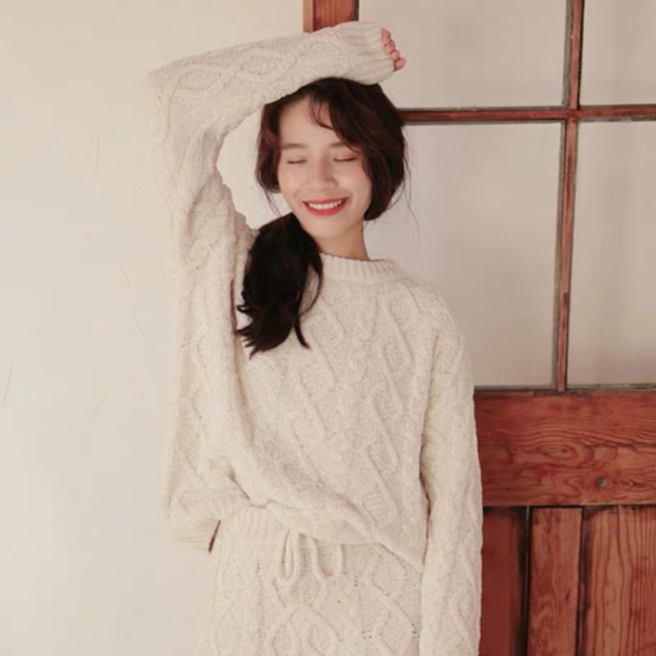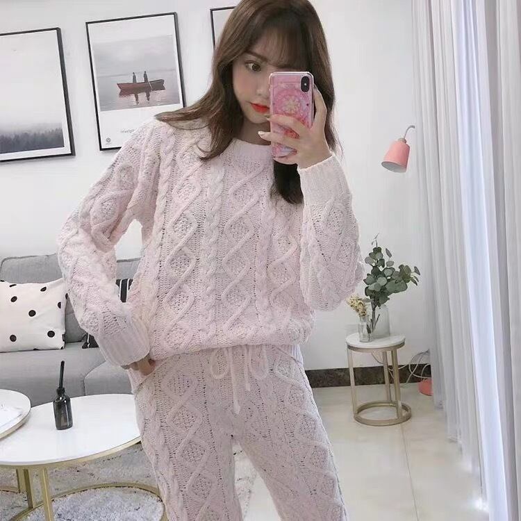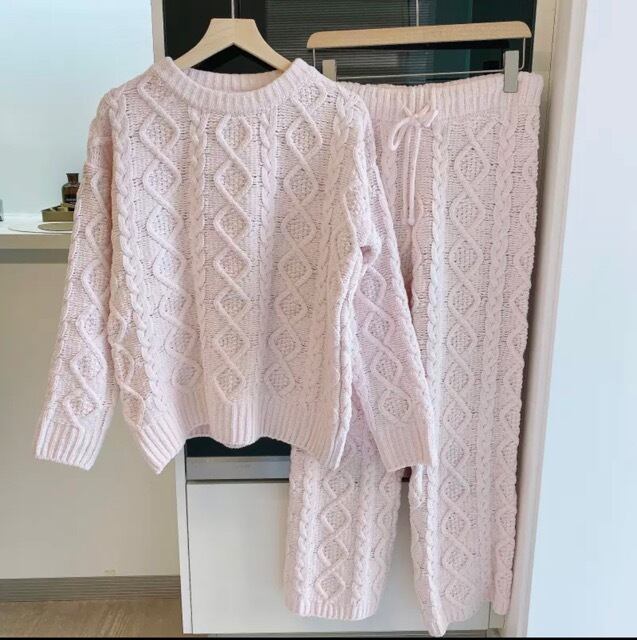 《入荷待ち》秋冬 ざっくり編み ケーブルニット 上下セット ニットパジャマ スプリングカラー 春色ニット Roomwear