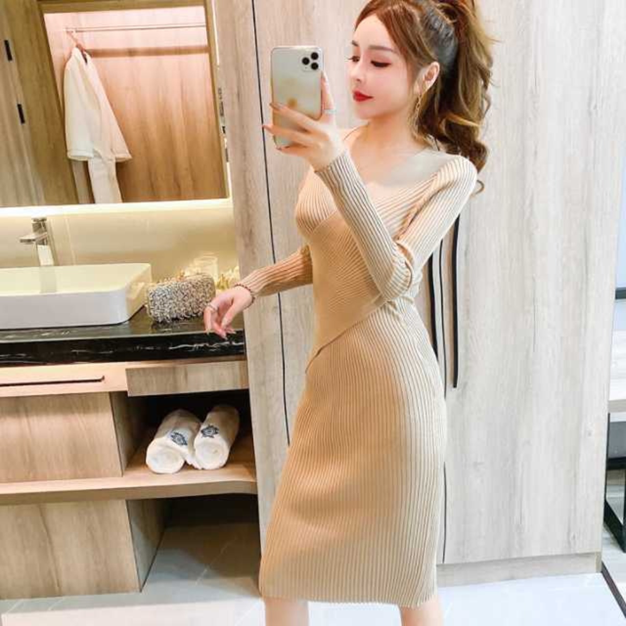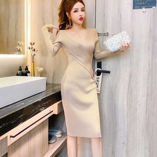 《入荷待ち》 全2色 ワンピース ニットワンピース タイトワンピ カシュクール レディース 春秋冬ワンピース Vネック ワンピ フェミニン オシャレ ワンピース ミディ丈 長袖 セクシー キレセク