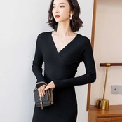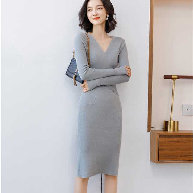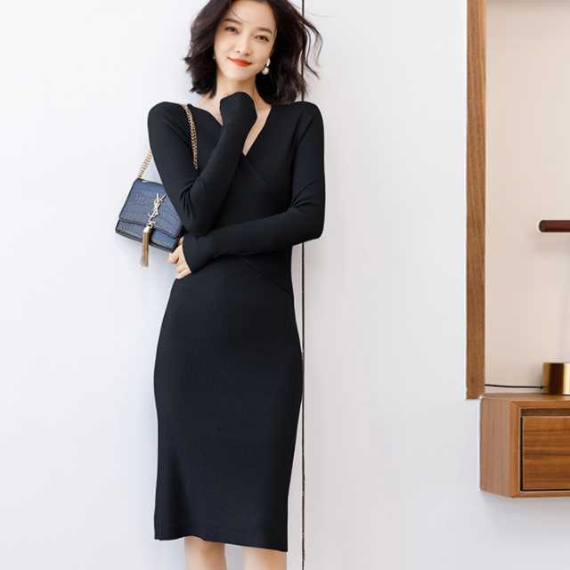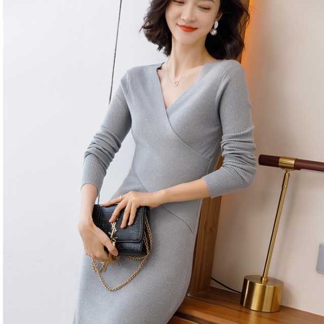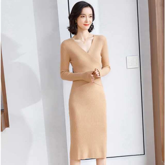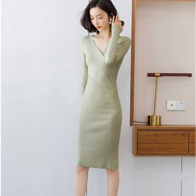 《入荷待ち》全4色 ワンピース ニットワンピース タイトワンピ カシュクール レディース 春秋冬ワンピース Vネック ワンピ フェミニン オシャレ ワンピース ミディ丈 長袖 セクシー キレセク