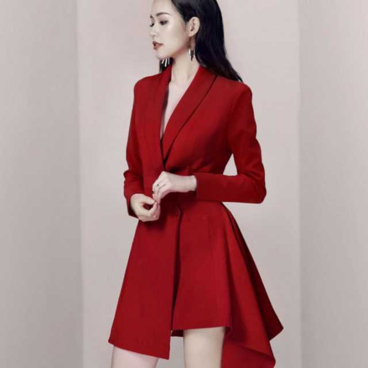 深めのVネックとアシンメトリーな裾がお洒落でセクシーなスーツ風ワンピース。