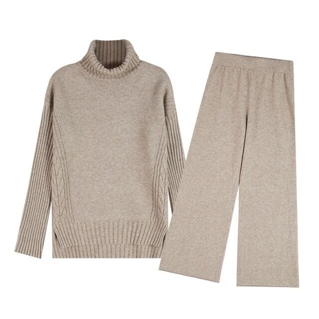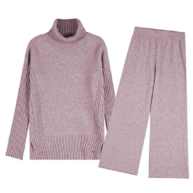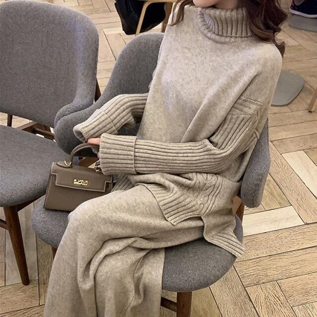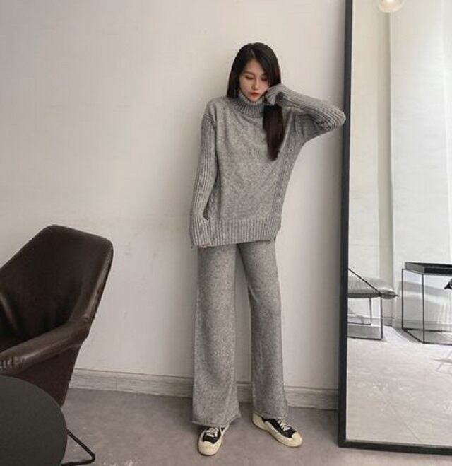 大きめニットとワイド型パンツデザインで大人シルエットを演出するセットアップ。