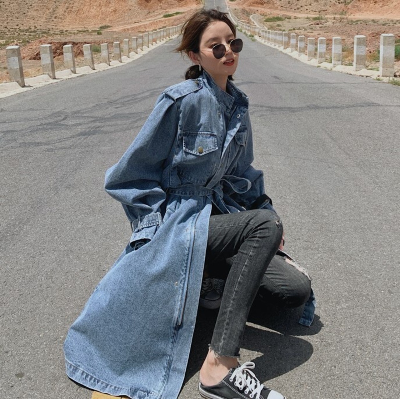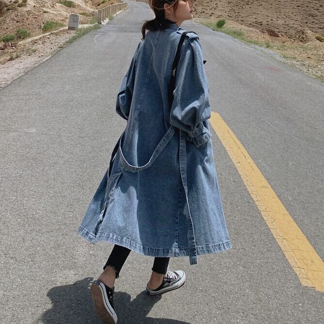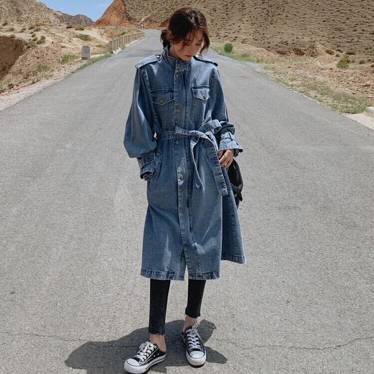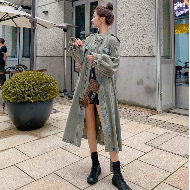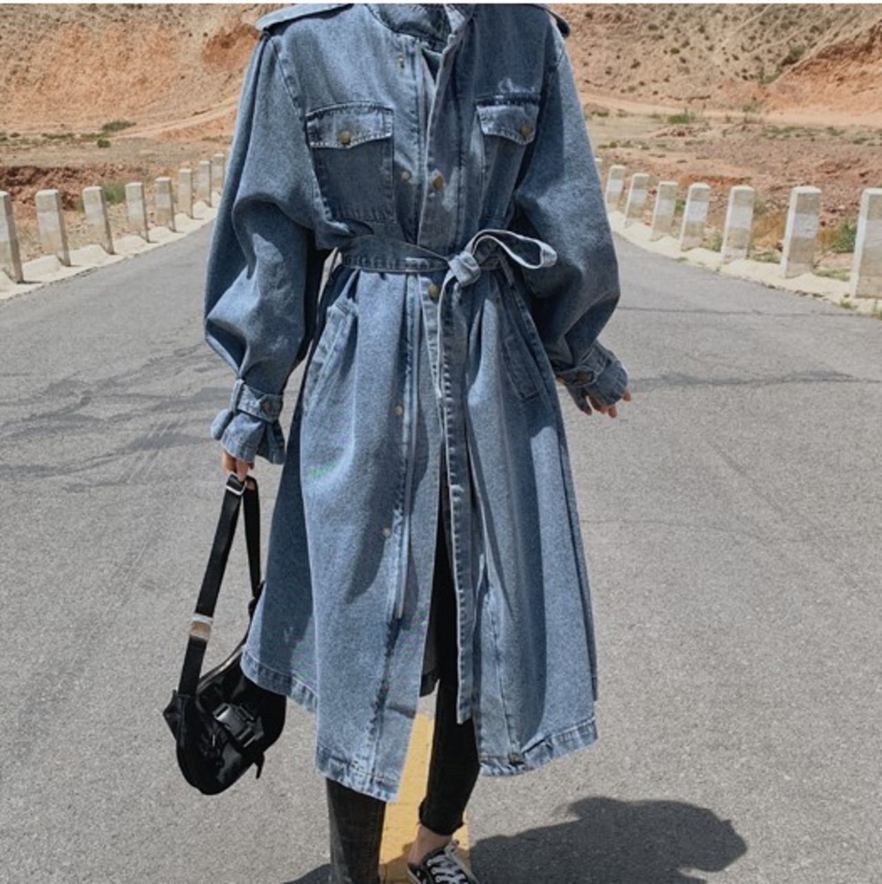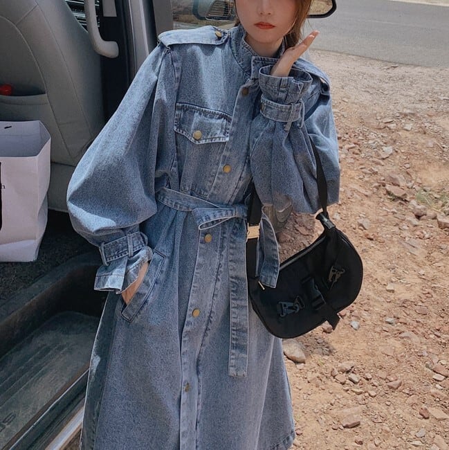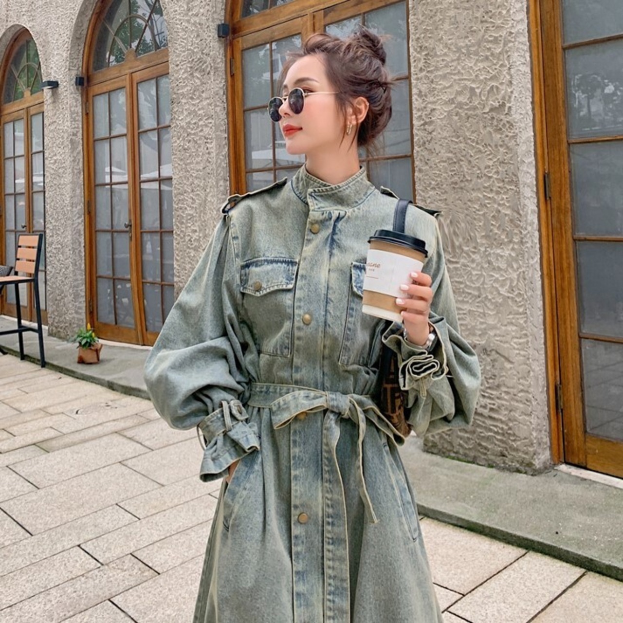 《入荷待ち》全2色 小さいサイズ レディース アウター デニム トレンチ コート ロング丈 スタンドカラー ウエストマーク ボリューム袖 ヴィンテージ 大人かっこいい カジュアル 春 秋 キレナチュ