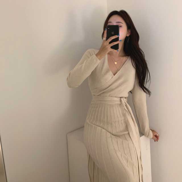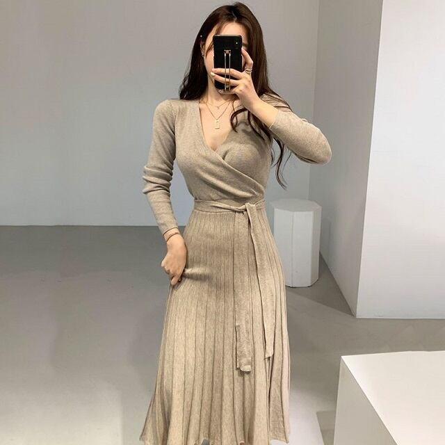 《再入荷》全4色 ニットワンピース 春秋 レディース プリーツワンピース フレアワンピース Vネック プリーツワンピ ウエストリボン ウエストマーク ロングワンピース セクシー 長袖 Aライン ニットワンピ オフィス OL エレガント キレイめ お呼ばれ キレセクキレセク