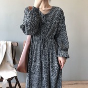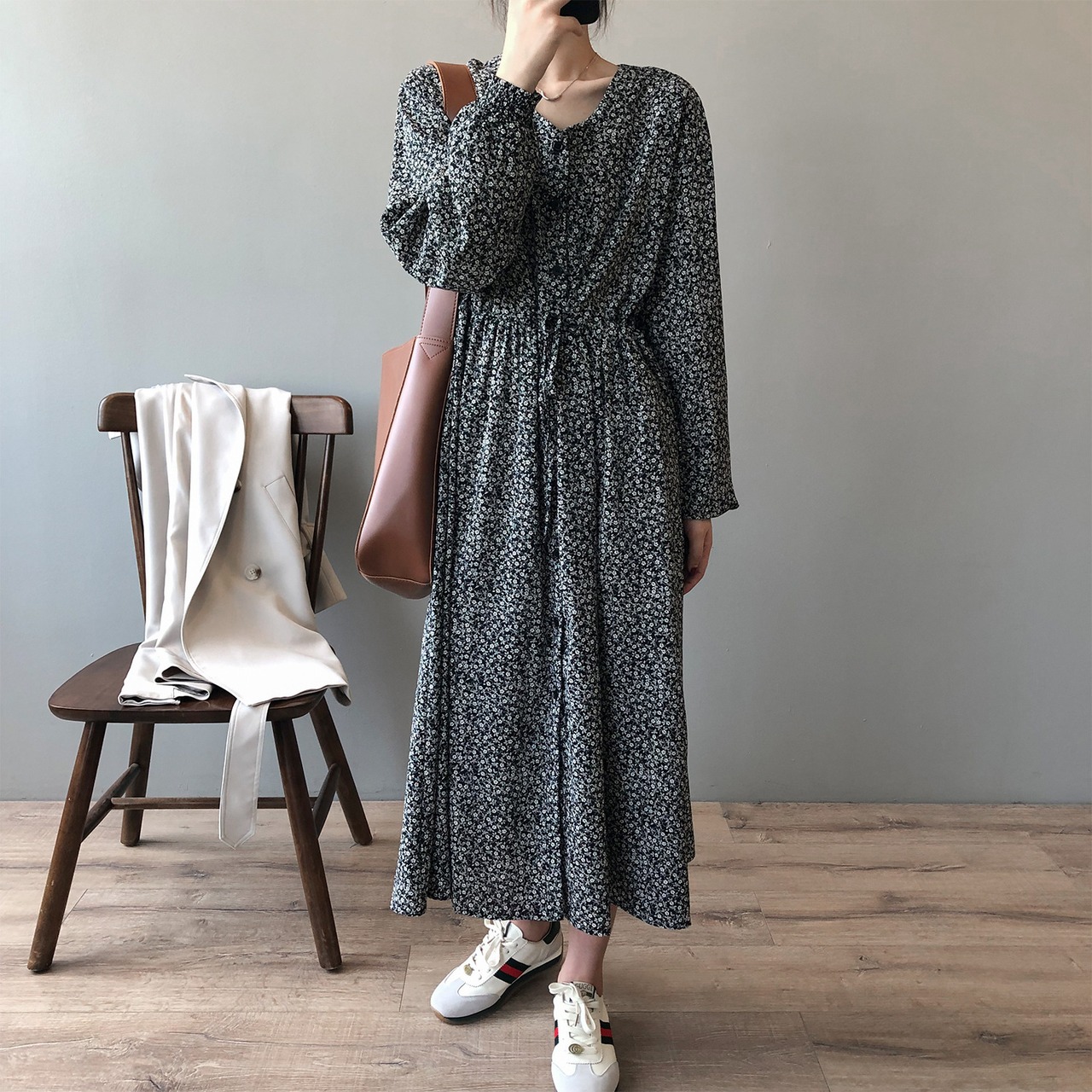 全2色 レディース ワンピース フラワーパターン 小花柄 フレア Aライン Vネック ノーカラー ロング丈 ミモレ丈 フロントボタン モノトーン きれいめ ナチュラル フェミニン 春 秋 キレナチュ