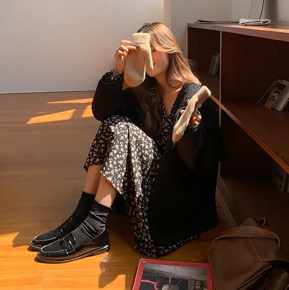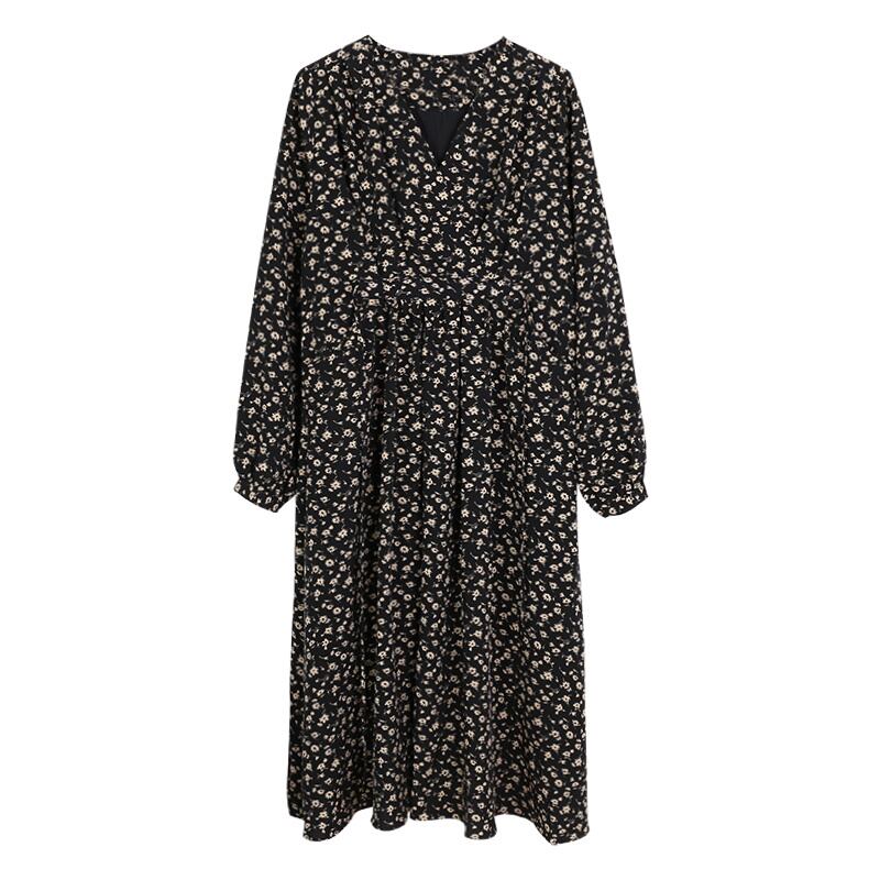 《入荷待ち》小さいサイズ レディース ワンピース フラワーパターン 小花柄 フレアスリーブ Aライン Vネック 膝下丈 ミモレ丈 モノトーン フェミニン きれいめ 上品 ナチュラル 春 秋 かわ小 キレナチュ