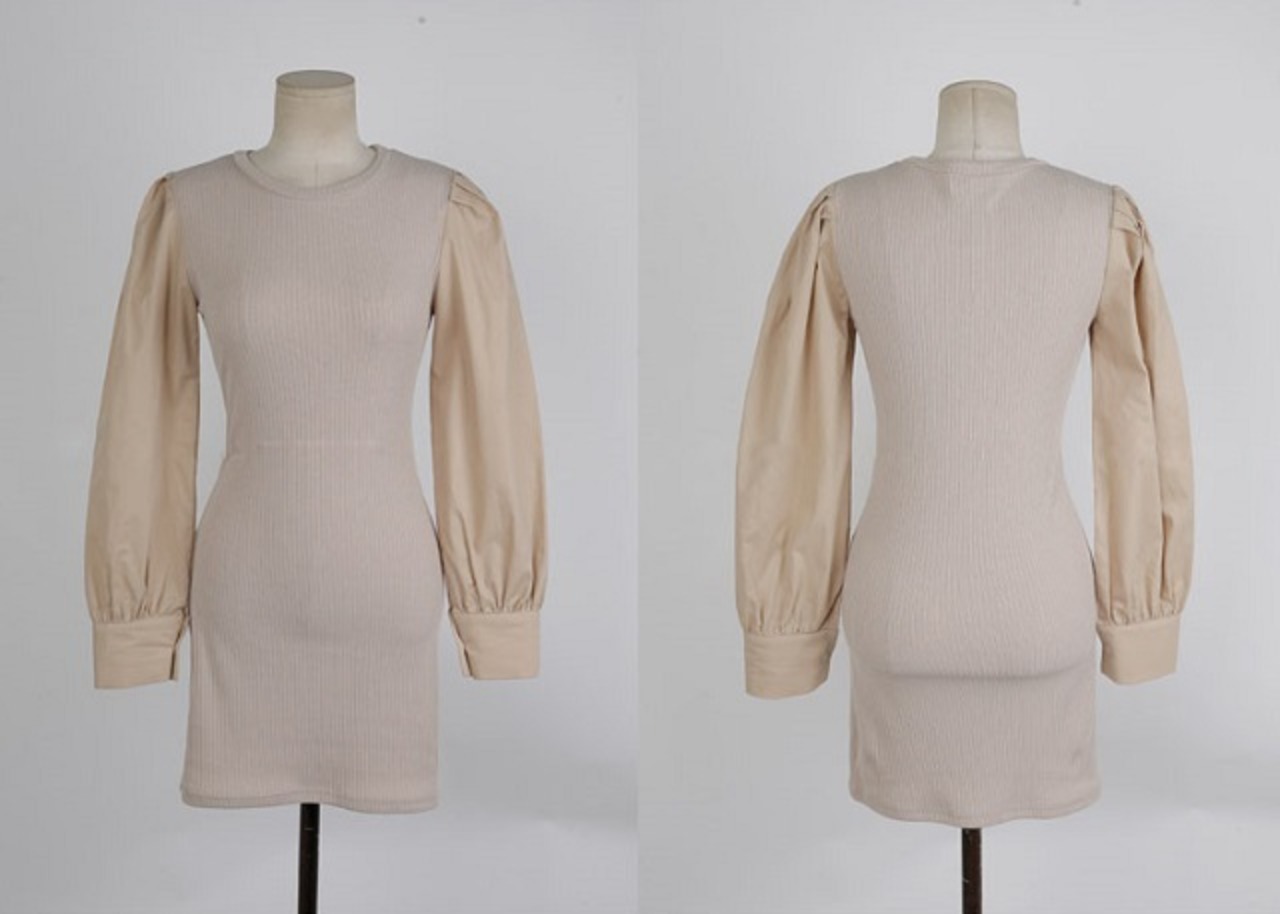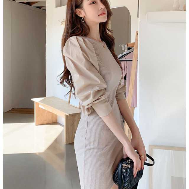 ワンピース ニット 長袖 ニットワンピース クルーネック ミニ パフスリーブ シフォンスリーブ タイト リブニット パーティ レディース ニットワンピ シフォン スリム フェミニン エレガント ハイウエスト おしゃれ ボディライン キレセク