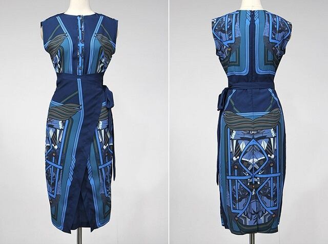 鮮やかな幾何学模様がひときわ目を引く、フェミニンなタイトワンピースドレスです♪