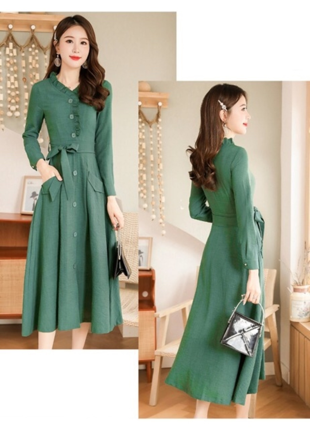 フリルが付いたネックラインはお顔を明るく演出。