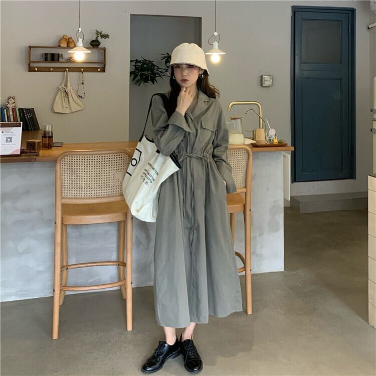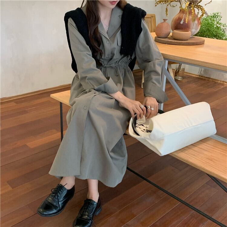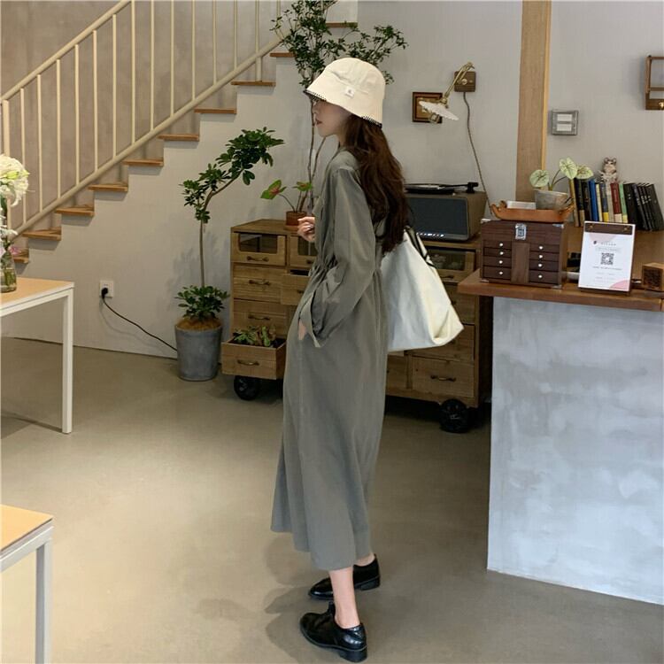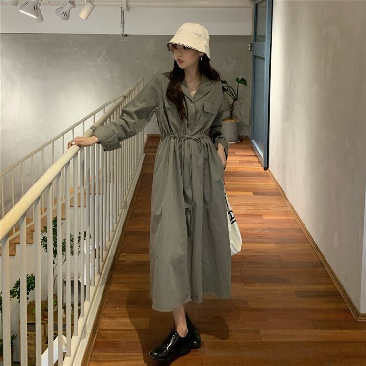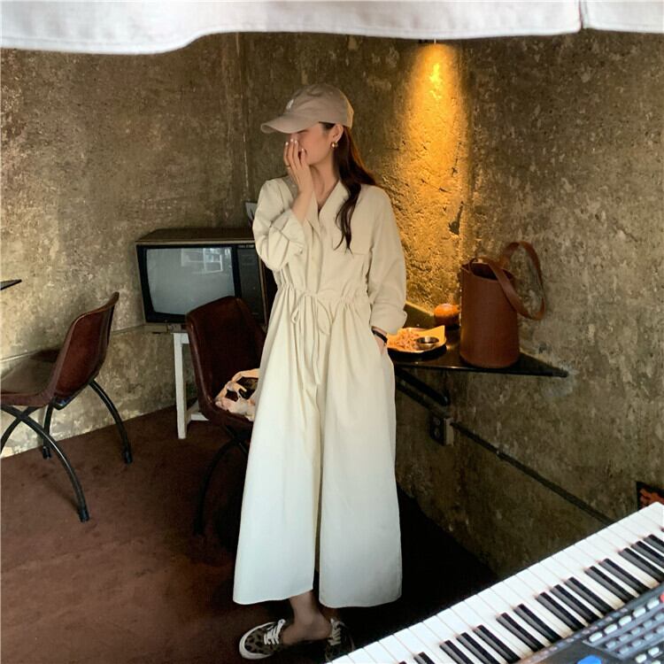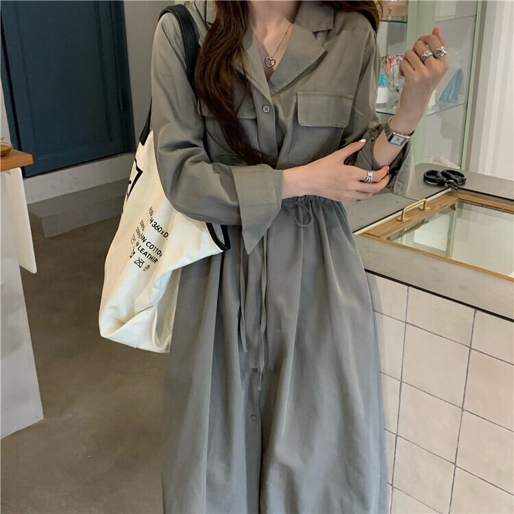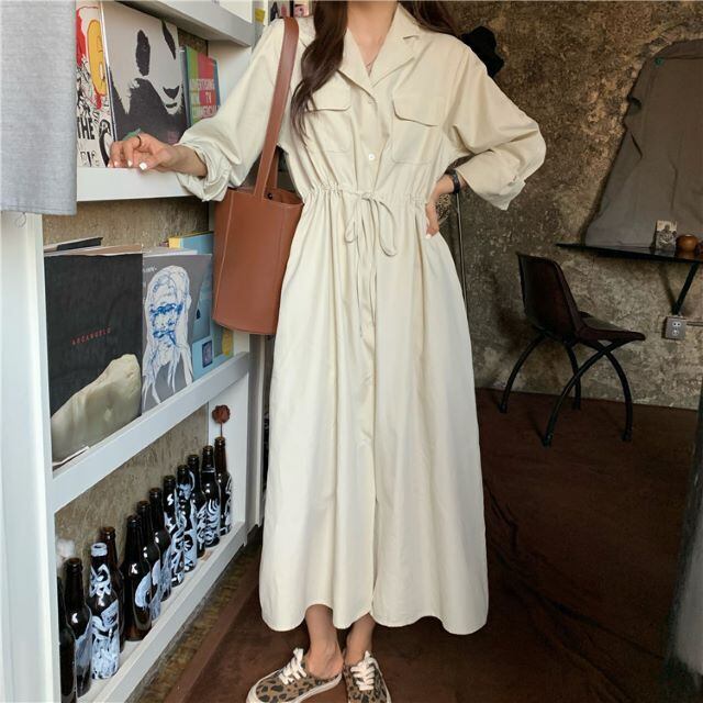 《再入荷》全2色 レディース ワンピース シャツワンピ Aライン ハイウエスト ウエストマーク リボン ミモレ丈 ロング丈 ゆったり 体型カバー シンプル きれいめ ナチュラル 春 秋 キレナチュ