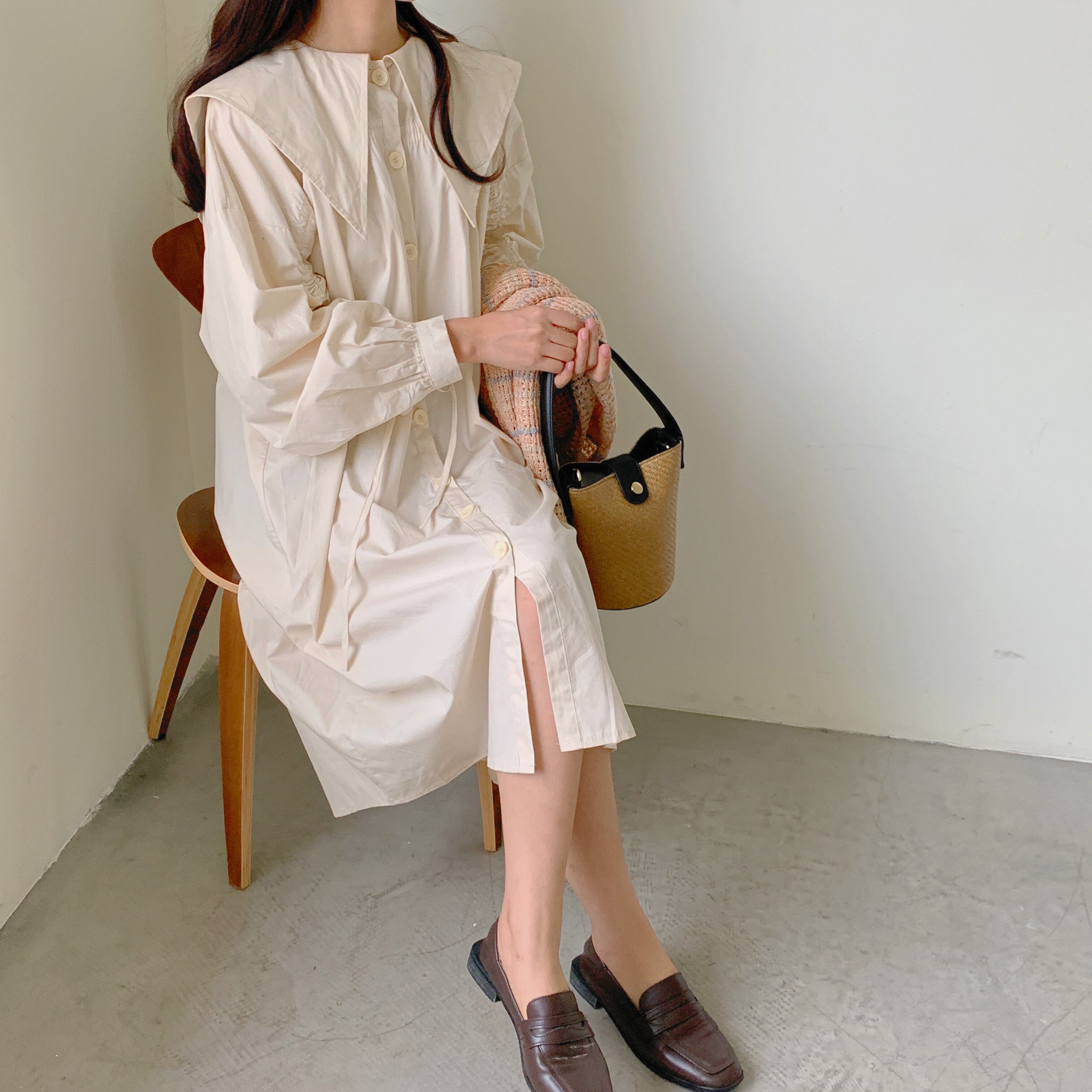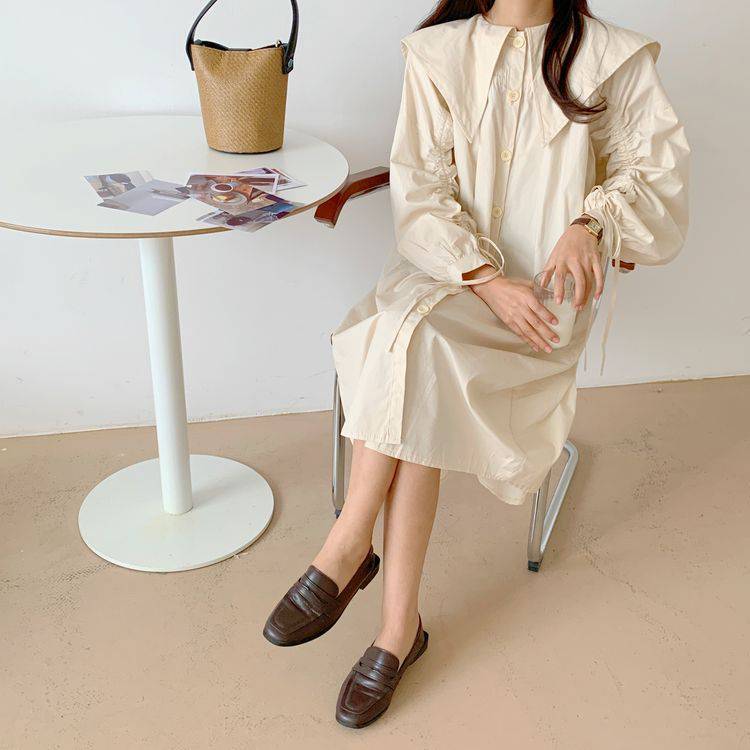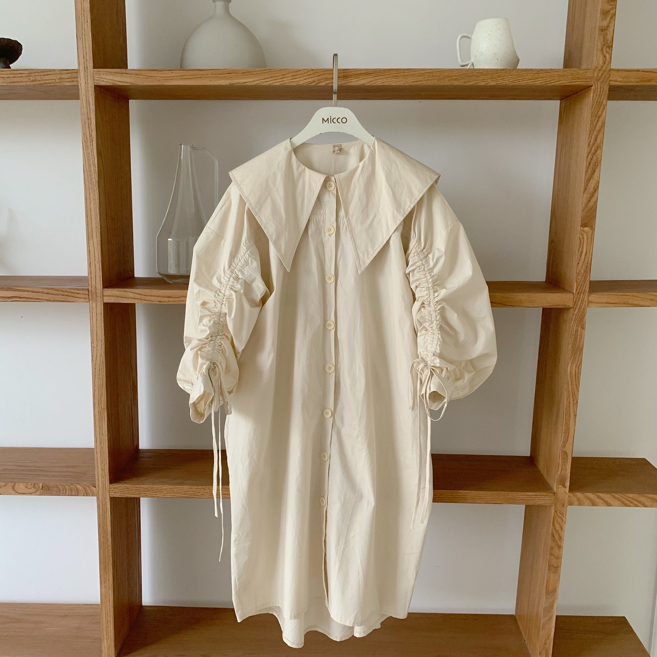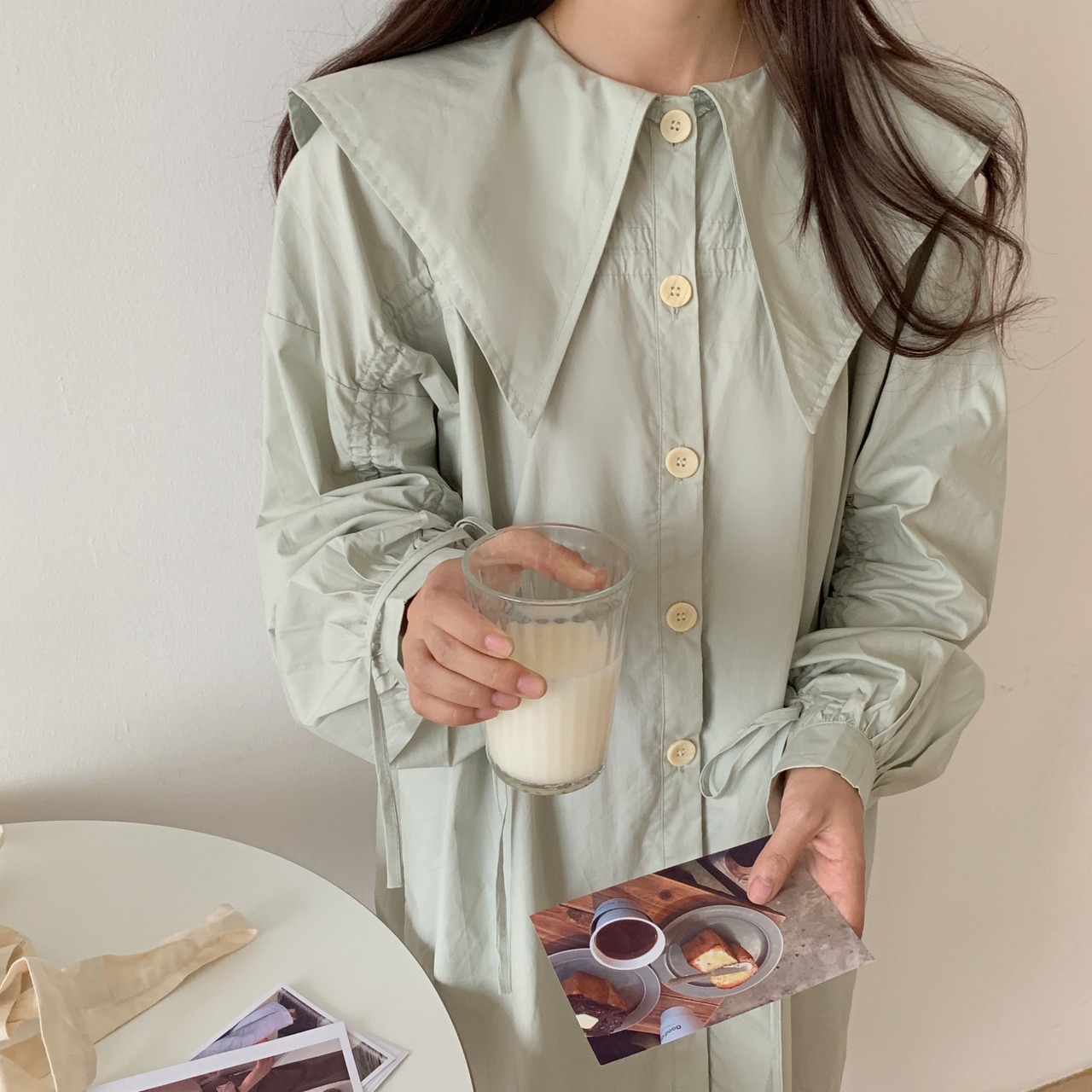 大きな襟と袖のギャザーがアクセントの、シャツワンピース。