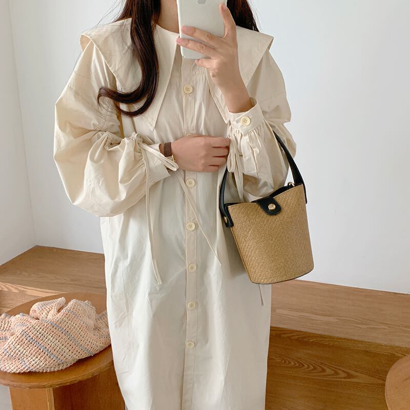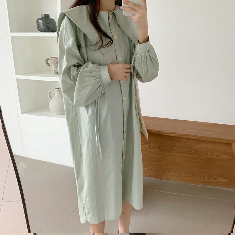 《入荷待ち》 全2色 レディース ワンピース ビッグカラー シャツワンピ ギャザー リボン ボリュームスリーブ ミディ丈 ゆったり 体型カバー シンプル フェミニン ナチュラル 春 秋 キレナチュ