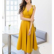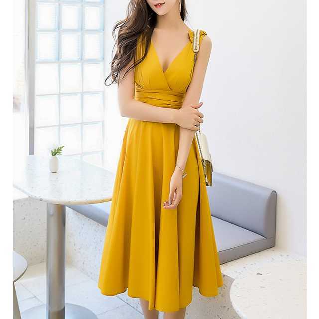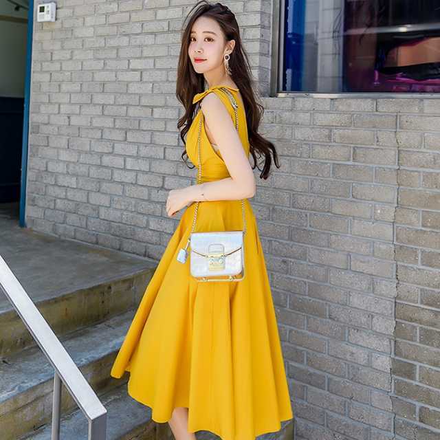 ちょっぴりセクシーな乙女心をくすぐるフレアワンピースは、元気いっぱいな明るい印象を与えるイエローカラーと、品のある落ち着きを魅せるブラックカラーの2種類からお選び頂けます♪