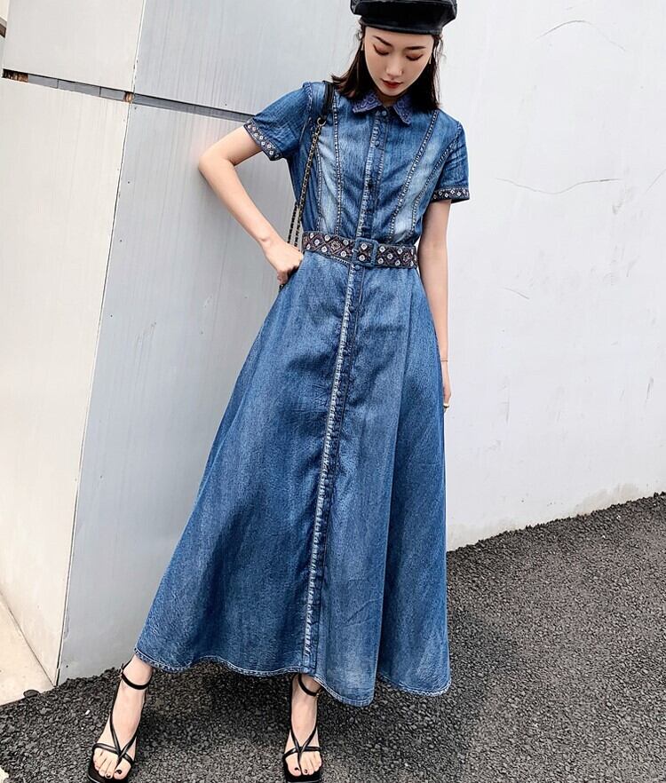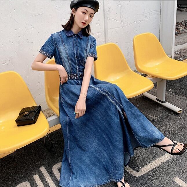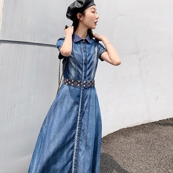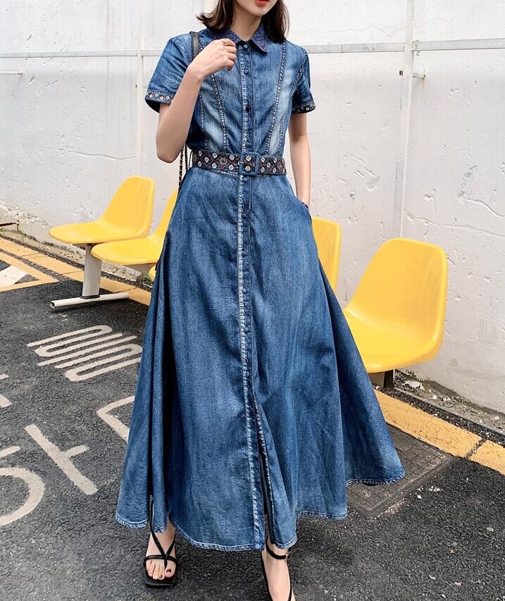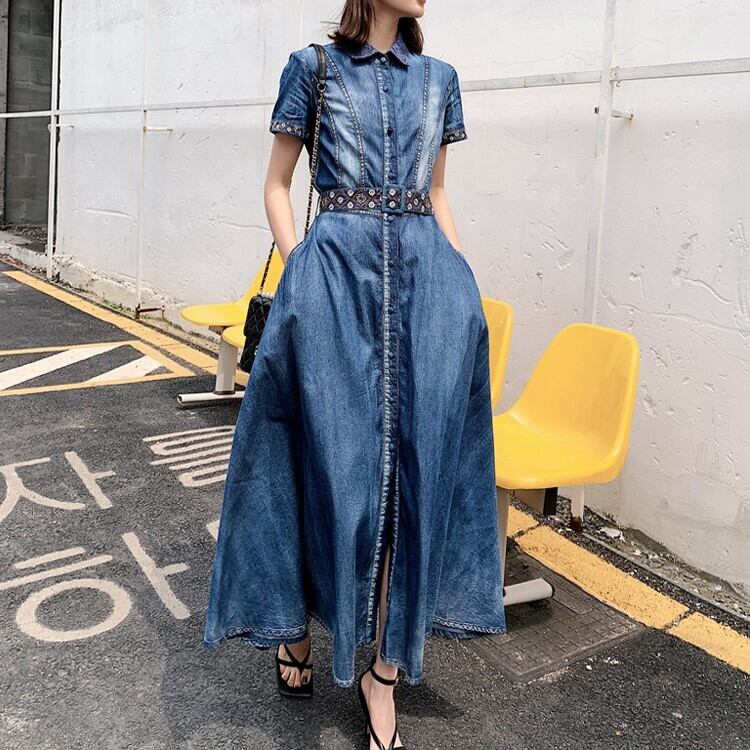 オシャレな刺繍のベルトがアクセントのデニムロングワンピース。