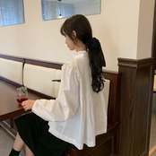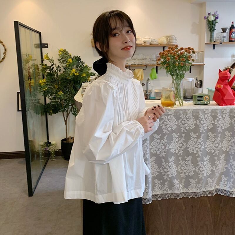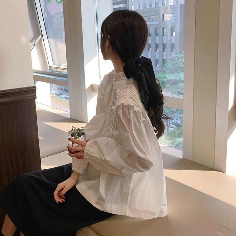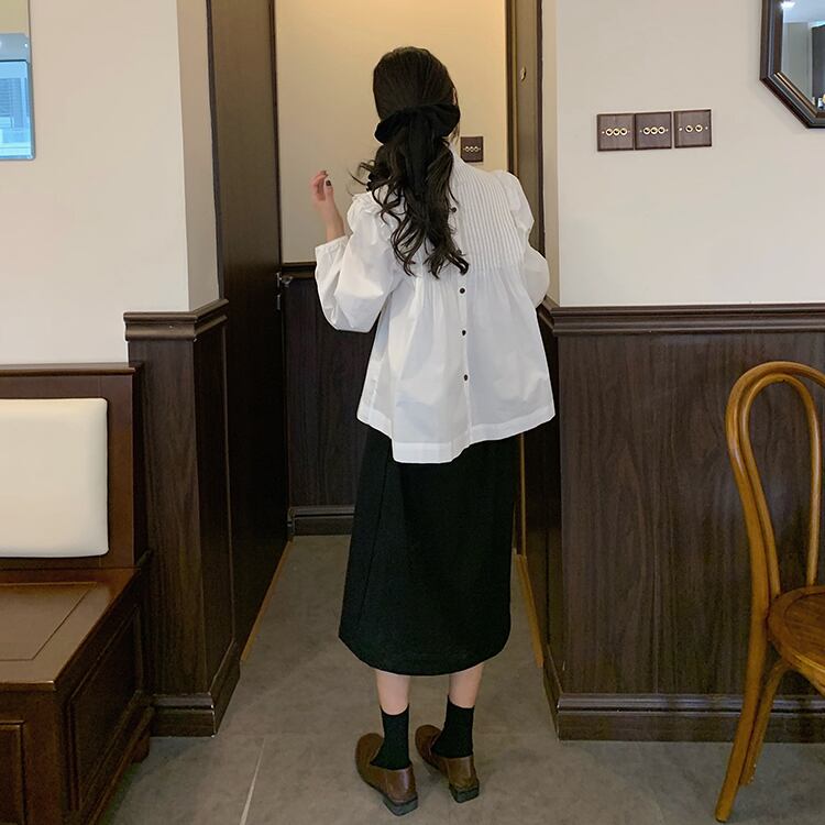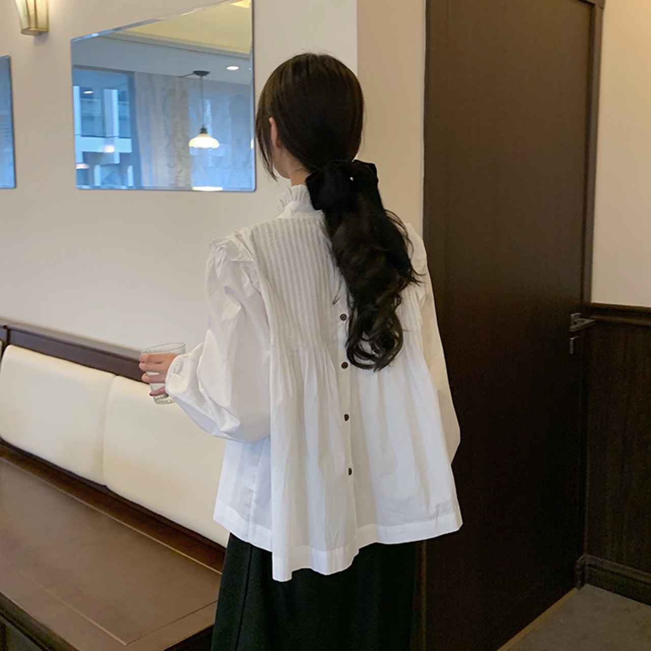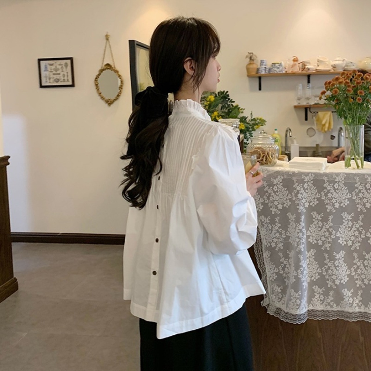 《入荷待ち》小さいサイズ レディース トップス ブラウス シャツ フリル襟 スタンドカラー バックボタン パフスリーブ シンプル ナチュラル フェミニン きれいめ カジュアル 春 秋 キレナチュ
