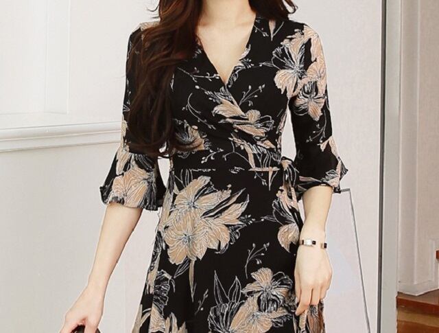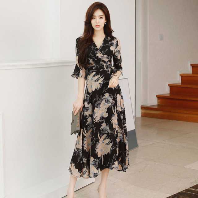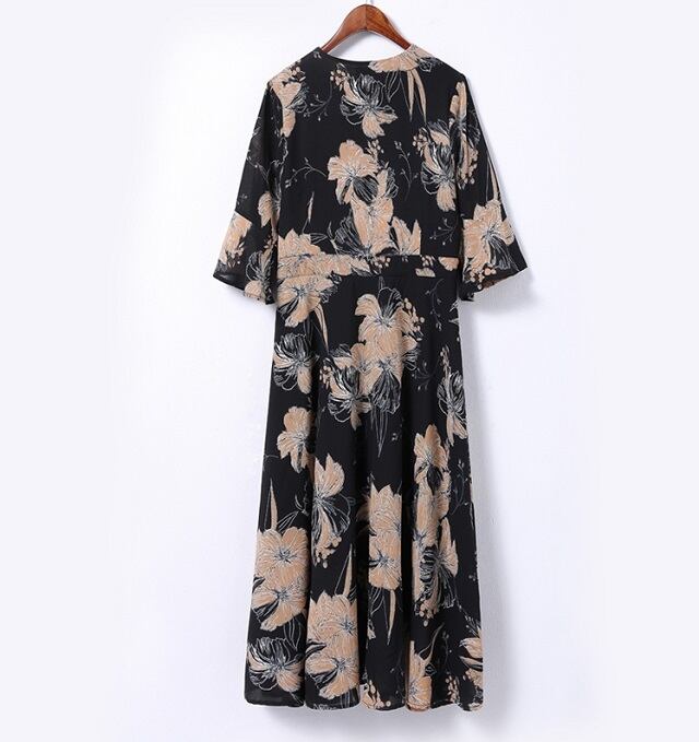 《入荷待ち》マキシワンピース ロングワンピース セクシーワンピース セクシードレス ワンピ ボタニカル 七分袖 ベルスリーブ Vカット Vネック マキシ スリット 花柄 ブラック Vネック カシュクール フレア ハイウエスト キレセク
