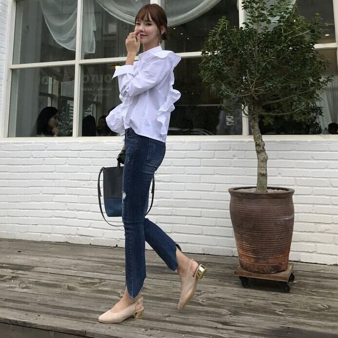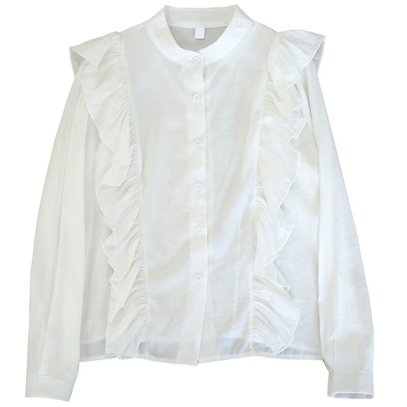 大きめフリルが目を惹く、スタンドカラーブラウス。