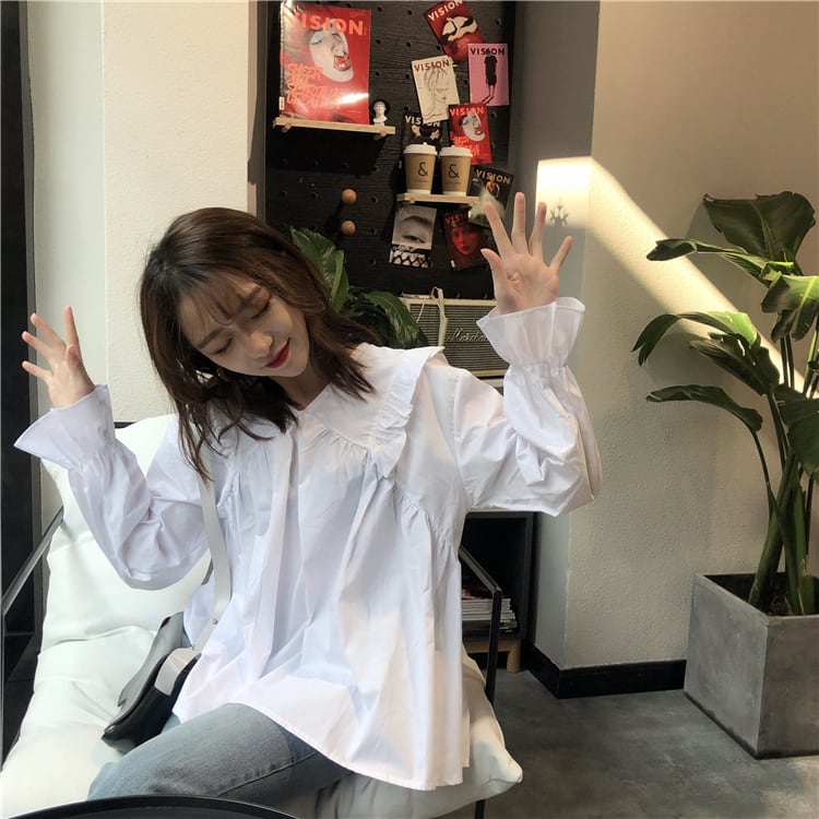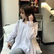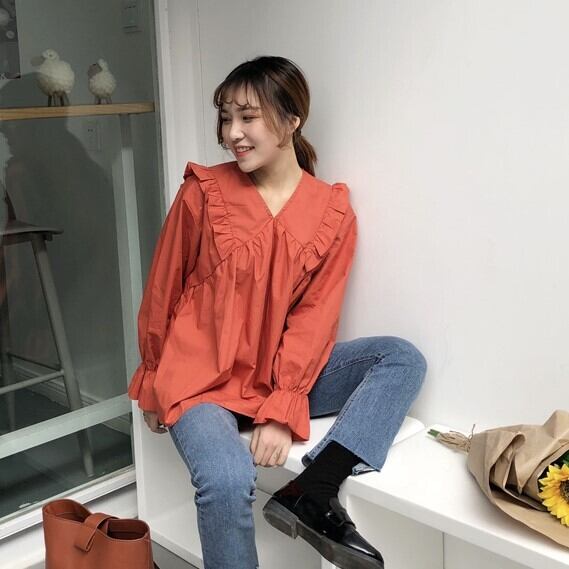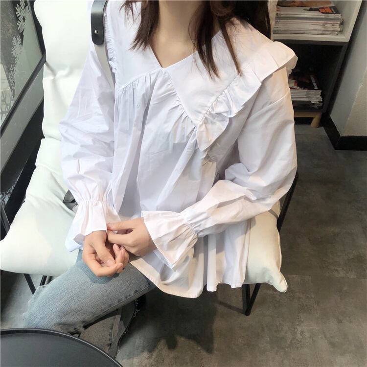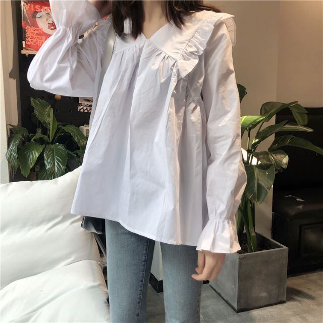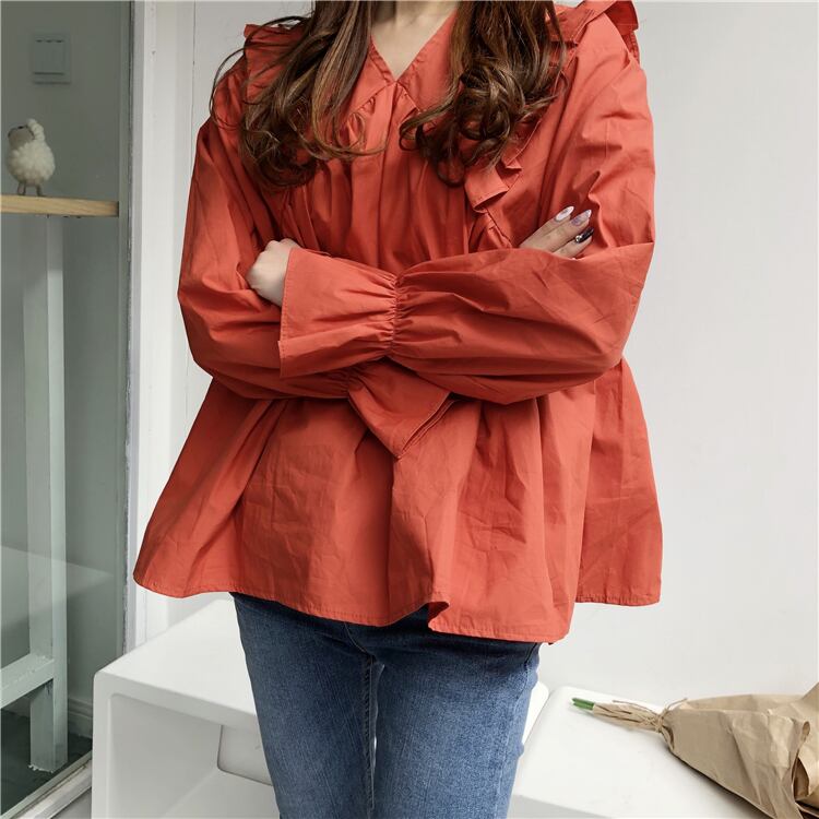 《入荷待ち》全2色 レディース トップス フリル Vネック ブラウス プルオーバー チュニック コットン シャツ キャンディスリーブ 長袖 シンプル ナチュラル フェミニン カジュアル 春 秋 キレナチュ