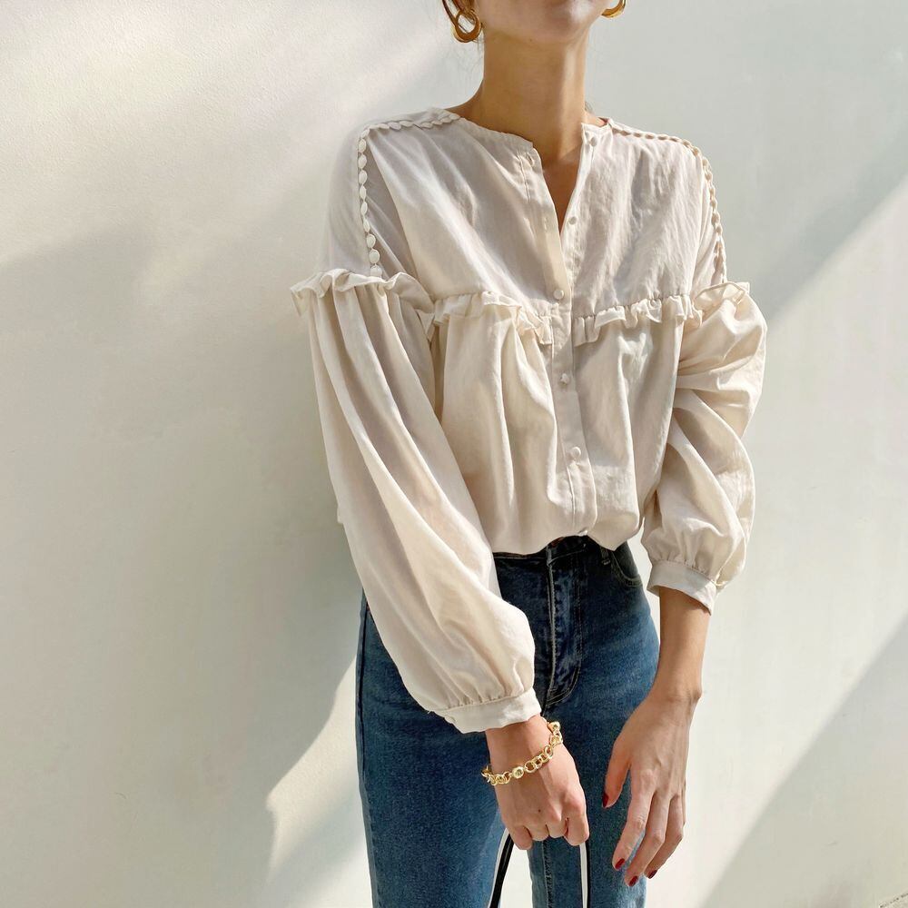 全2色 レディース トップス フリル シャツ ブラウス ノーカラー 長袖 ボリューム袖 シンプル ナチュラル フェミニン きれいめ 春 秋 キレナチュ