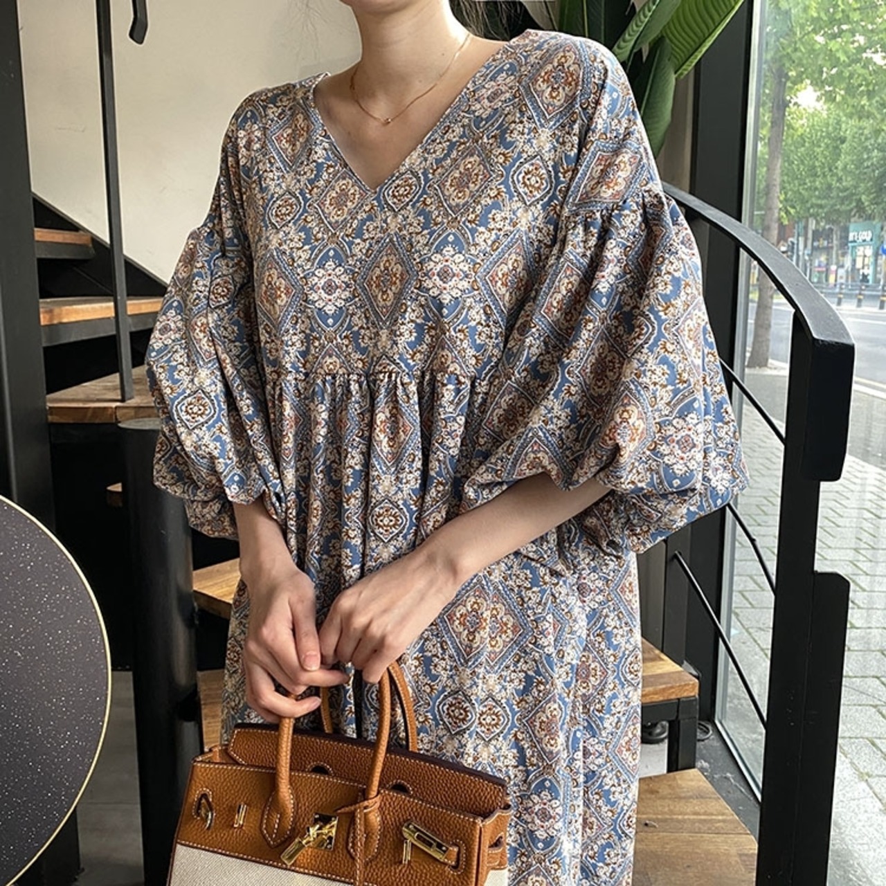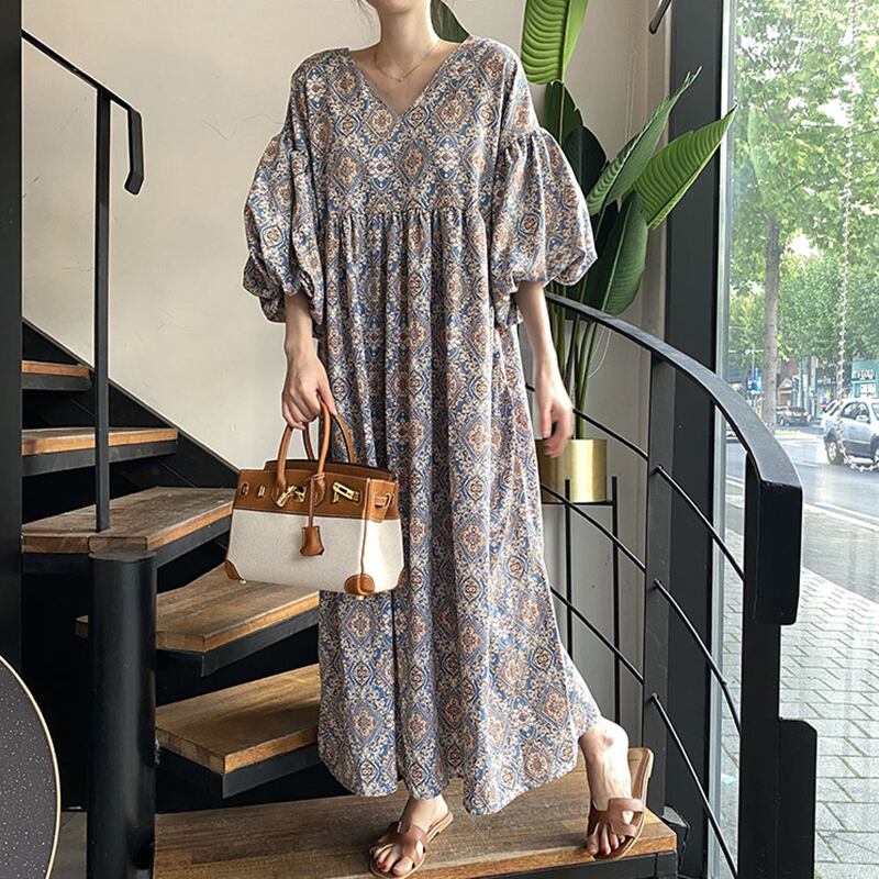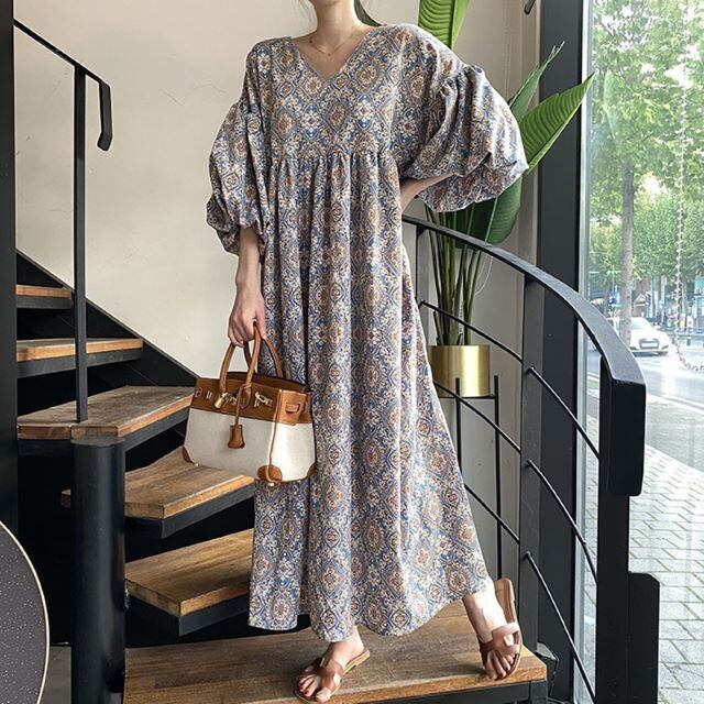 《入荷待ち》全2色 レディース ワンピース エスニック柄 ロング丈 マキシ丈 Vネック ランタンスリーブ ぽわん袖 Aライン ゆったり 体型カバー ナチュラル フェミニン リゾート 春 夏 秋 キレナチュ