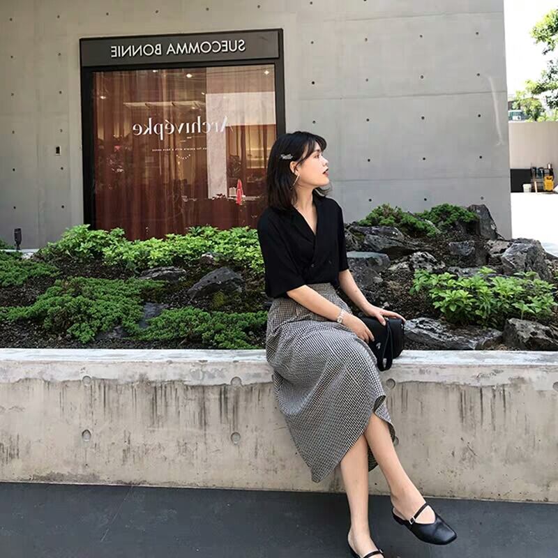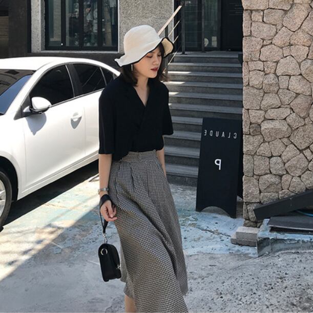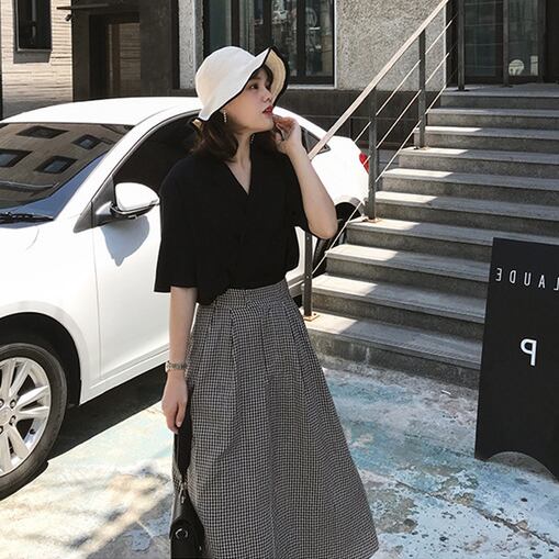 すっきりしたデザインのトップスと、チェック柄が可愛いスカートのセットアップ。