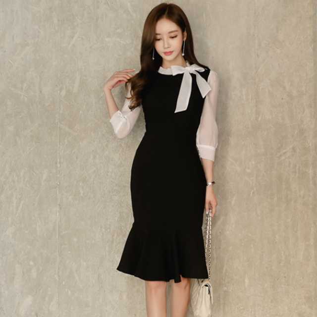 タイトワンピース セクシーワンピース ワンピ タイト マーメードライン 膝丈 ひざ シースルー ドレス 7分袖 袖あり 上品 清楚 おしゃれ リボン ママ 大人可愛い キレセク