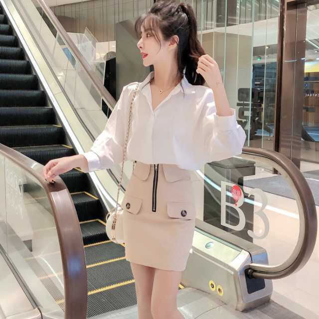 清潔感のあるゆったりした白いブラウス&タイトなミニスカートのセットアップです。