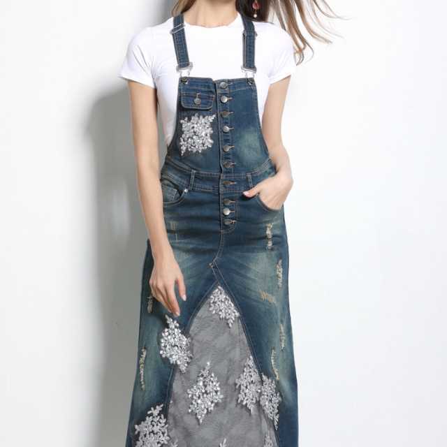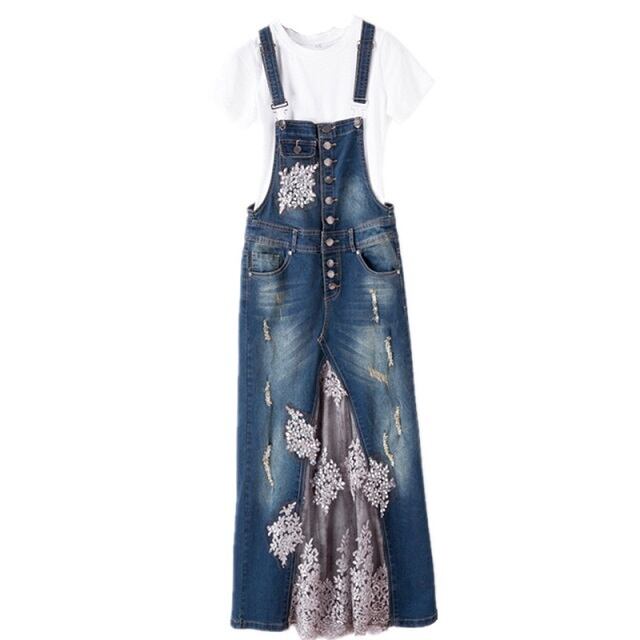 《入荷待ち》2点セット セットアップ 花柄刺繍 デニム ワンピース ジャンパースカート 異素材MIX Tシャツ レディース 春夏 レース タイト フォーマル 大人 上品 チュニック カットソー カジュアル セクシー キレセク