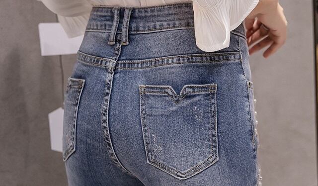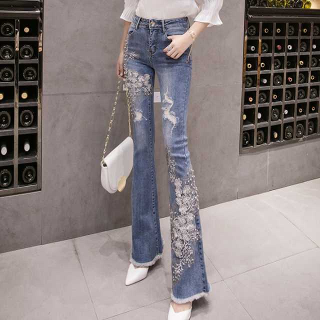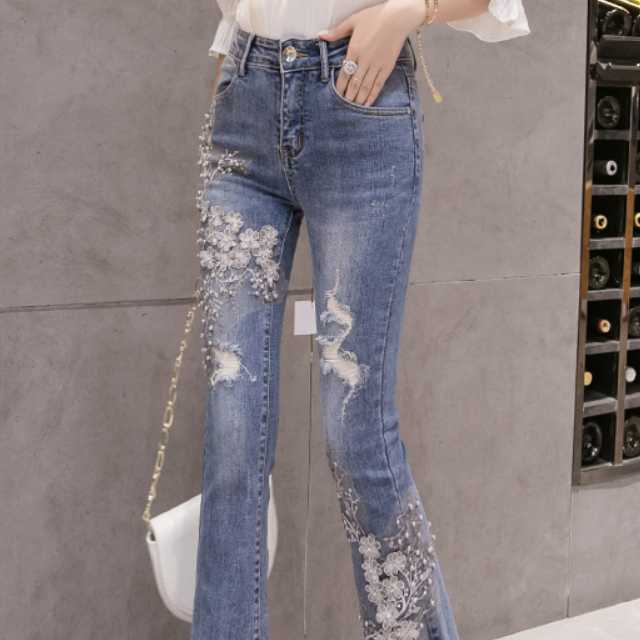 《入荷待ち》デニム デニムパンツ ブーツカット レディース 刺繍 パール フラワー ビジュー ダメージ 無地 フェミニン ブルー インディゴブルー デート カジュアル キレセク