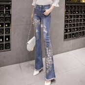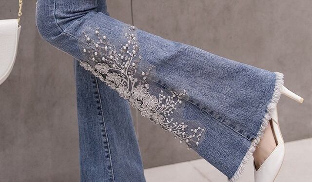 ダメージ加工の生地に華やかな刺繍やビジューを施した繊細なデザインが特徴。