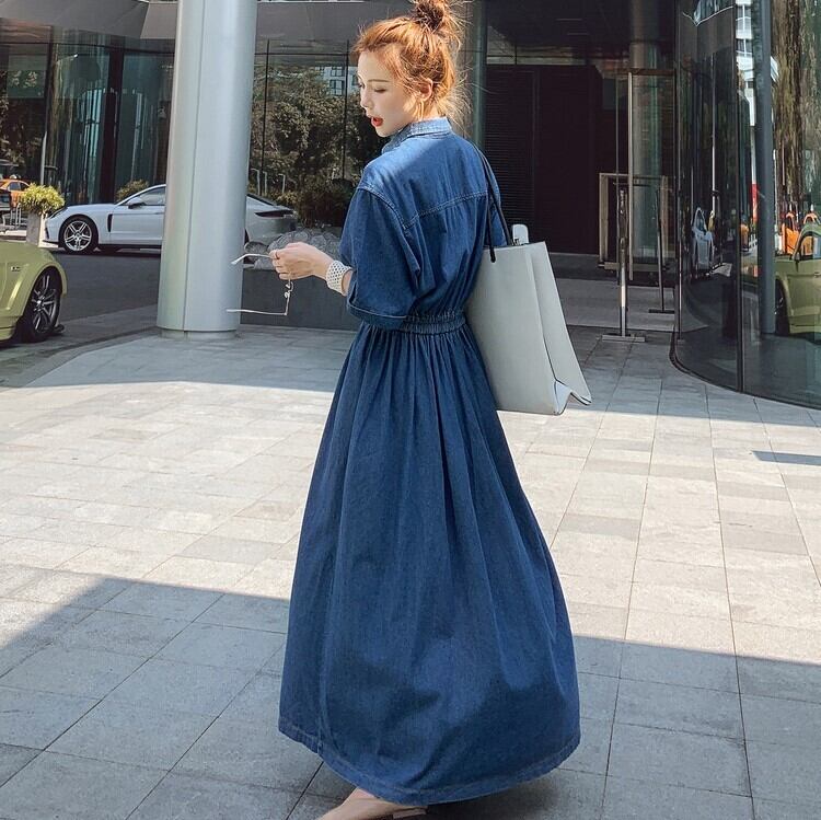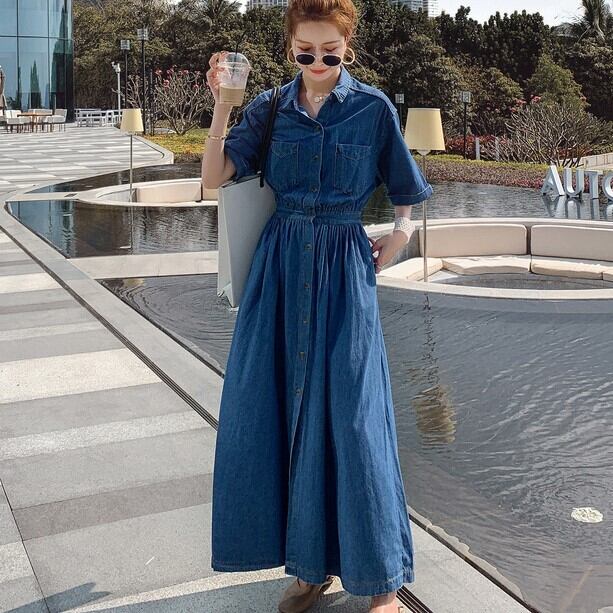 《入荷待ち》大きいサイズ 小さいサイズ ワンピース デニム シャツワンピ マキシ丈 ロング丈 半袖 ハイウエスト Aライン 体型カバー シンプル きれいめ レトロ ナチュラル フェミニン 大人カジュアル 春 夏 秋 キレナチュ