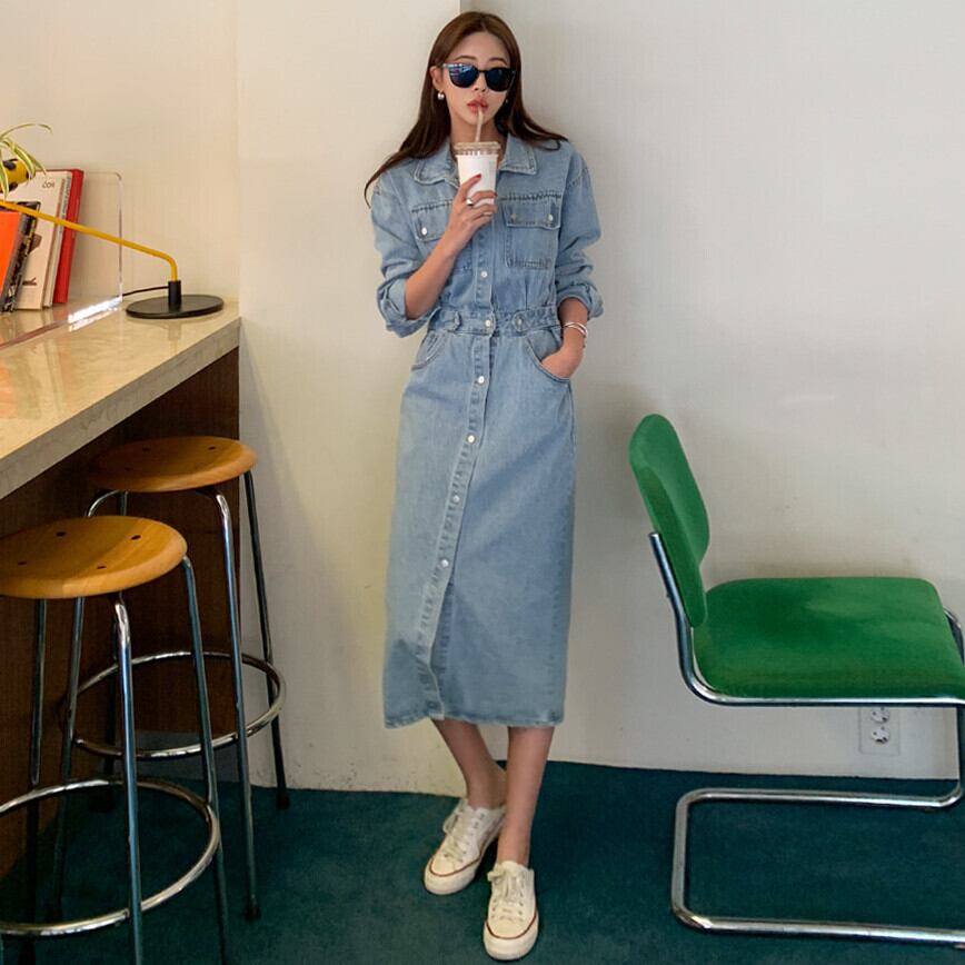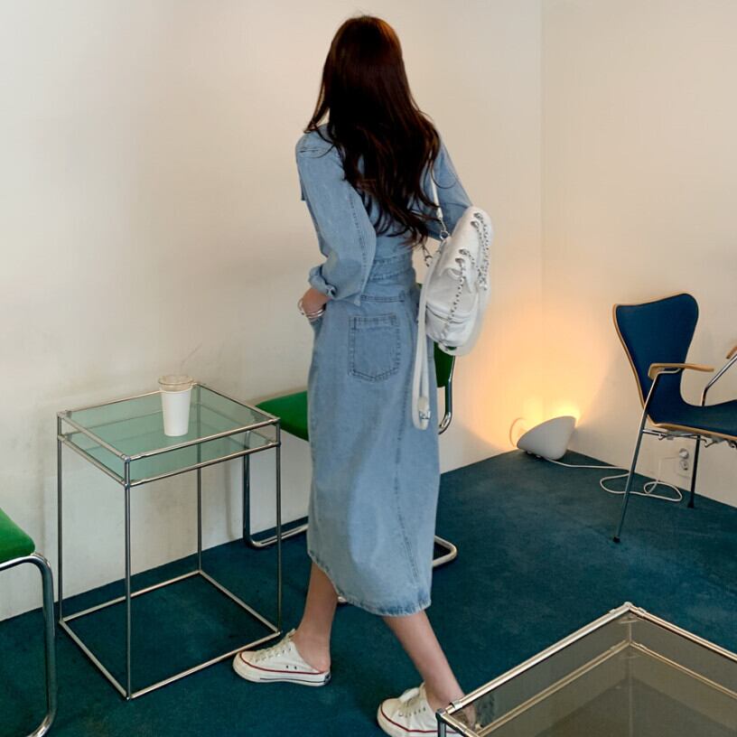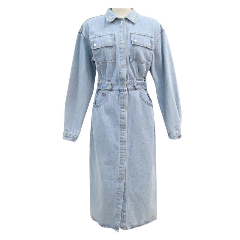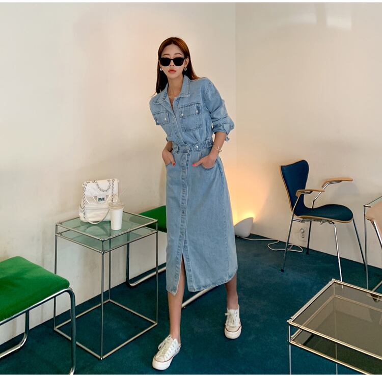 小さいサイズ ワンピース デニム シャツワンピ ミディ丈 膝下丈 長袖 ハイウエスト タイト シンプル きれいめ レトロ ナチュラル カジュアル 春 秋 キレナチュ