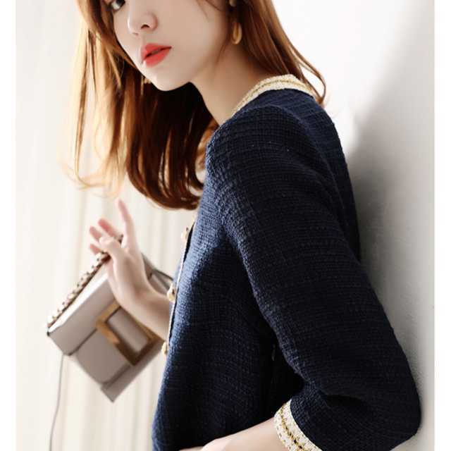 Vネックのバストライン部分とポケット部分にあしらったゴールドのボタンが高級感を演出。