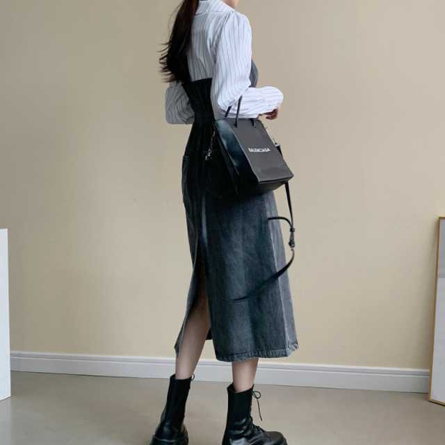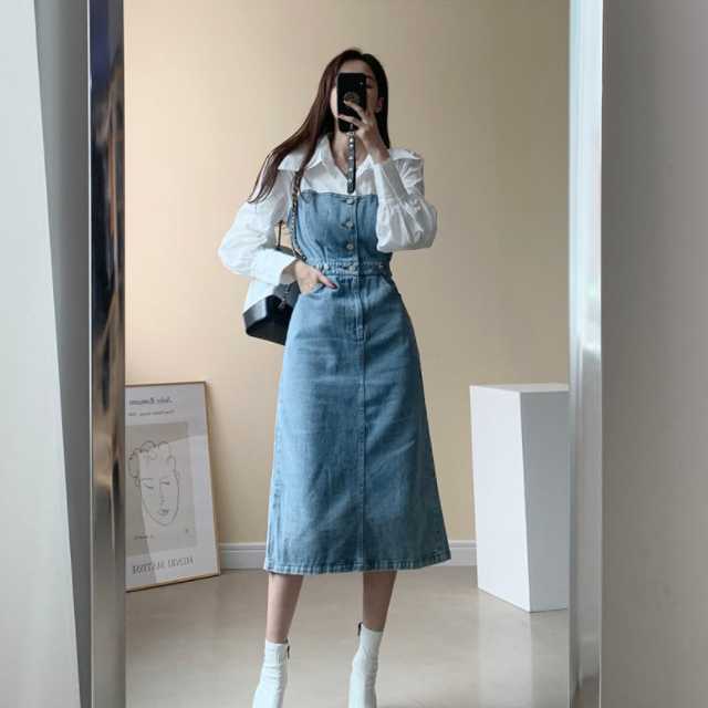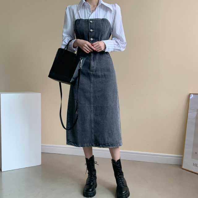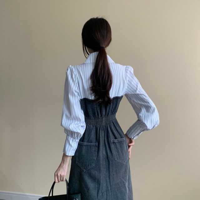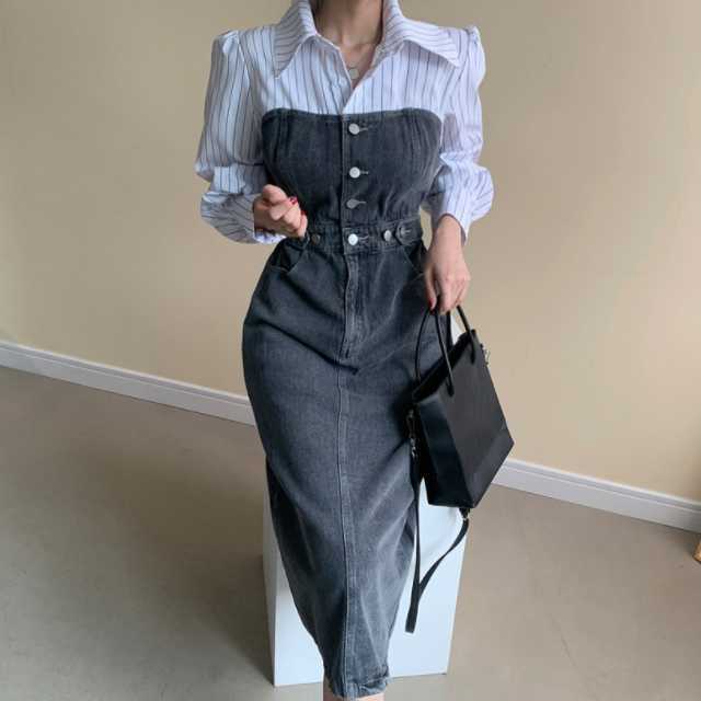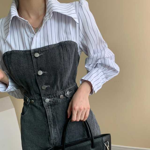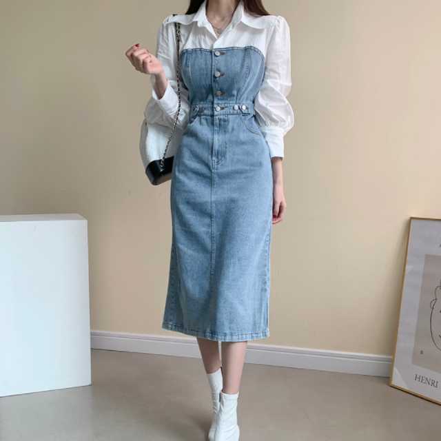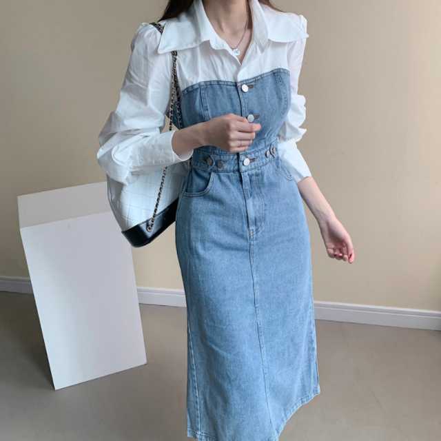 《入荷待ち》 全2色 ワンピース シャツワンピース オールインワン デニム デニムワンピース 可愛い 無地 ひざ下丈 ブラウス コンビ ドッキング 異素材 カジュアル シンプル フロントボタン デニムワンピ キレセク