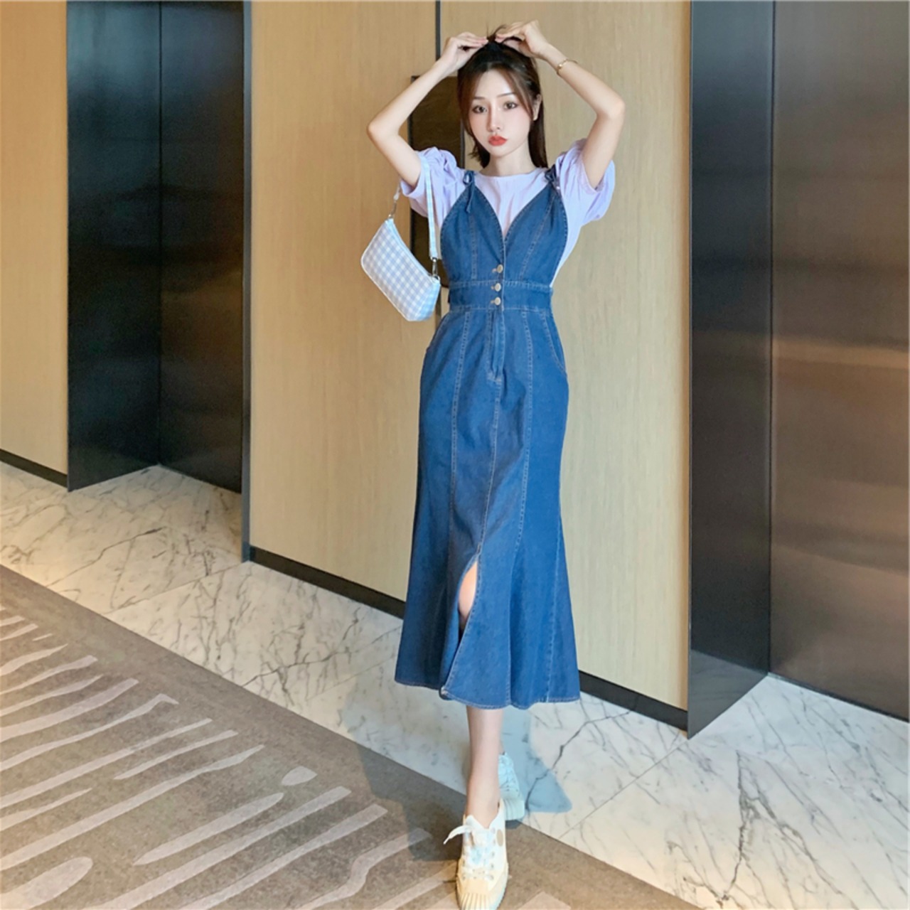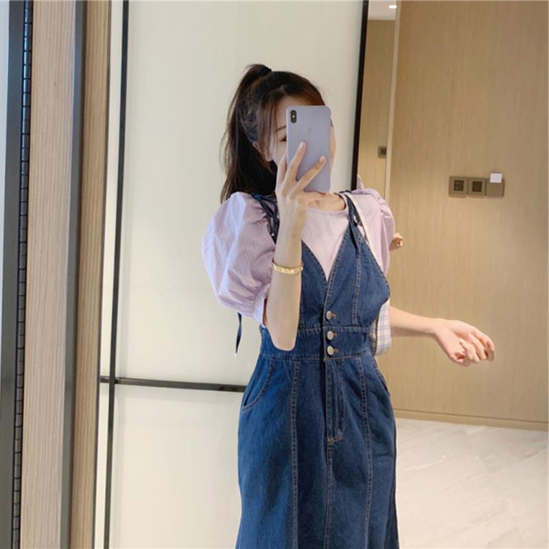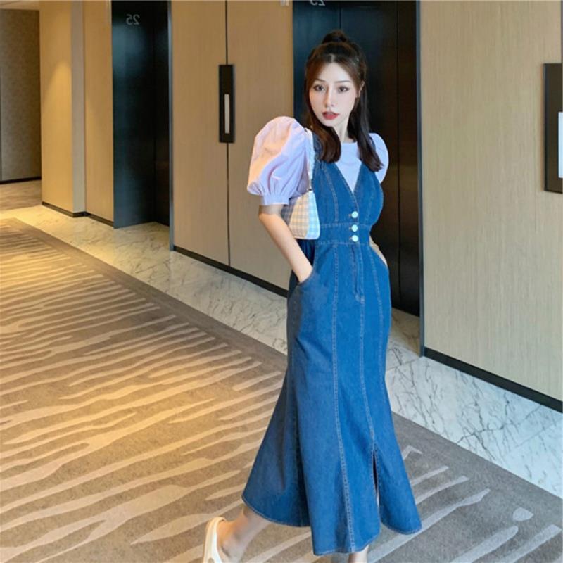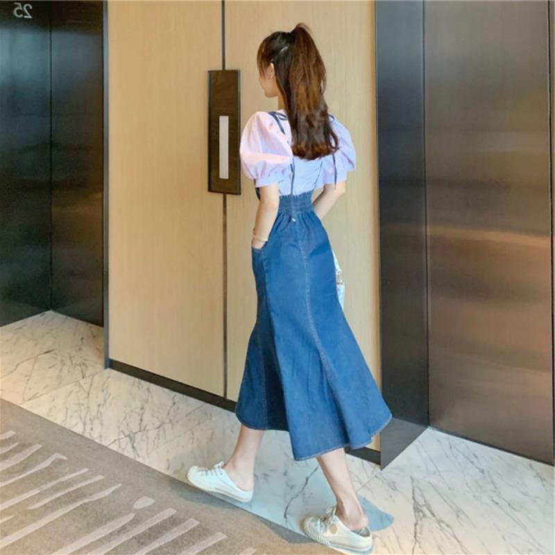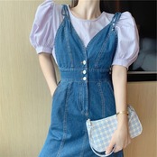 《入荷待ち》2点セット デニムワンピース ブラウス セットアップ デニムスカート ワンピース デニム サロペット ワンピース ミモレ丈 ひざ下丈 トップス パフスリーブ きれいめ キュート レディース キレセク