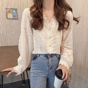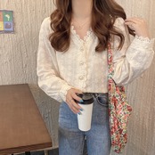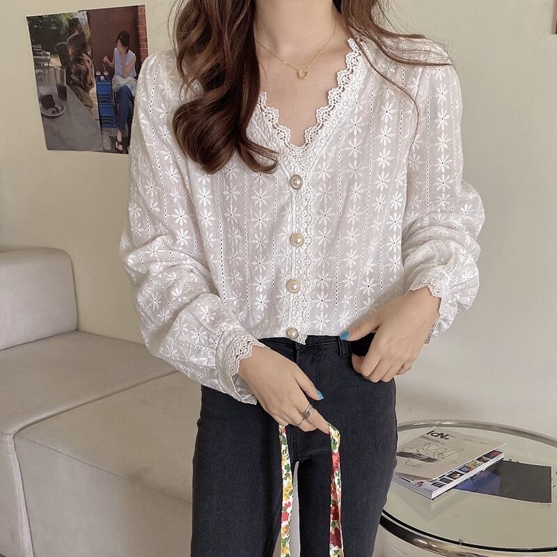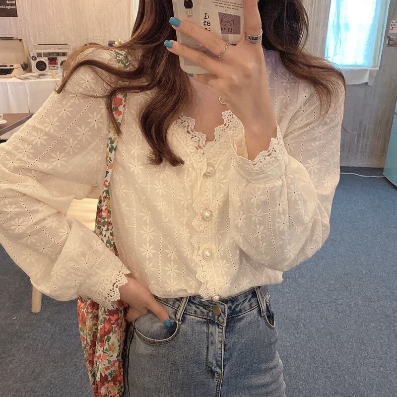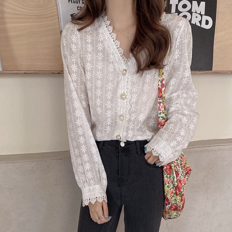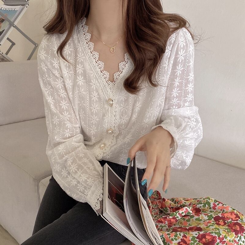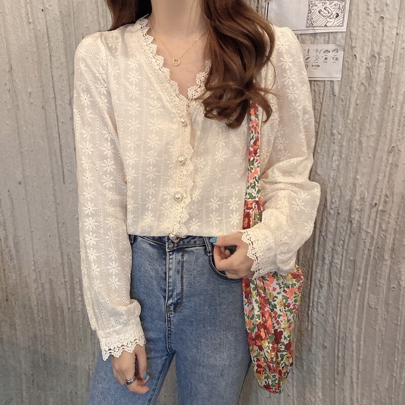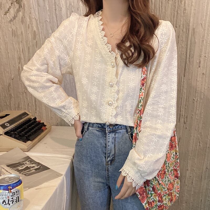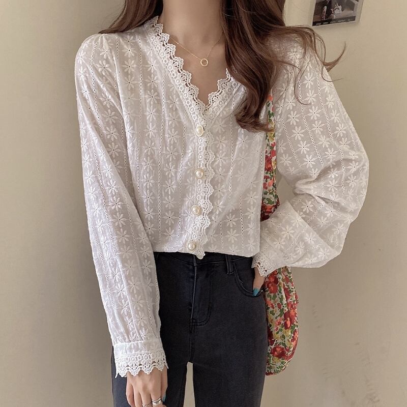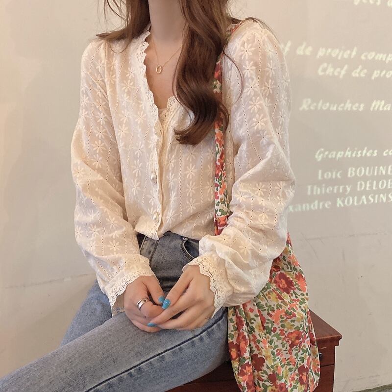 《入荷待ち》 全2色 トップス ノーカラー ブラウス シャツ パンチング レース 長袖 シンプル きれいめ ナチュラル カジュアル 春 秋 キレナチュ