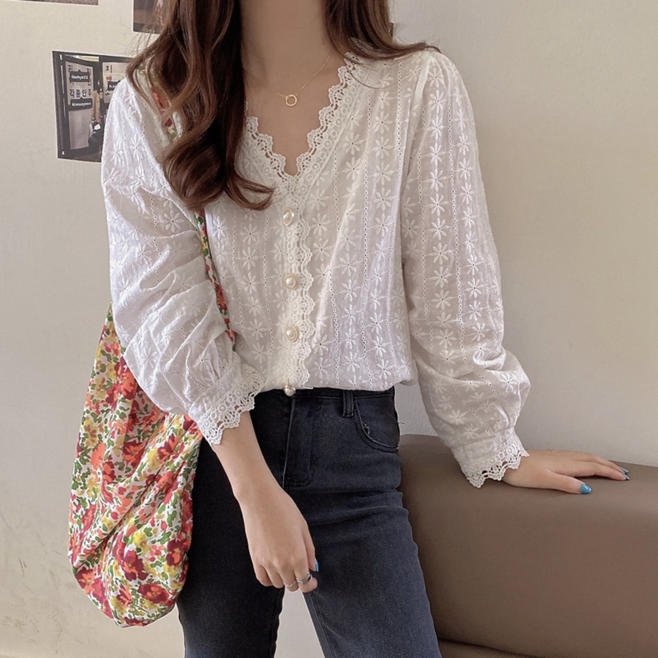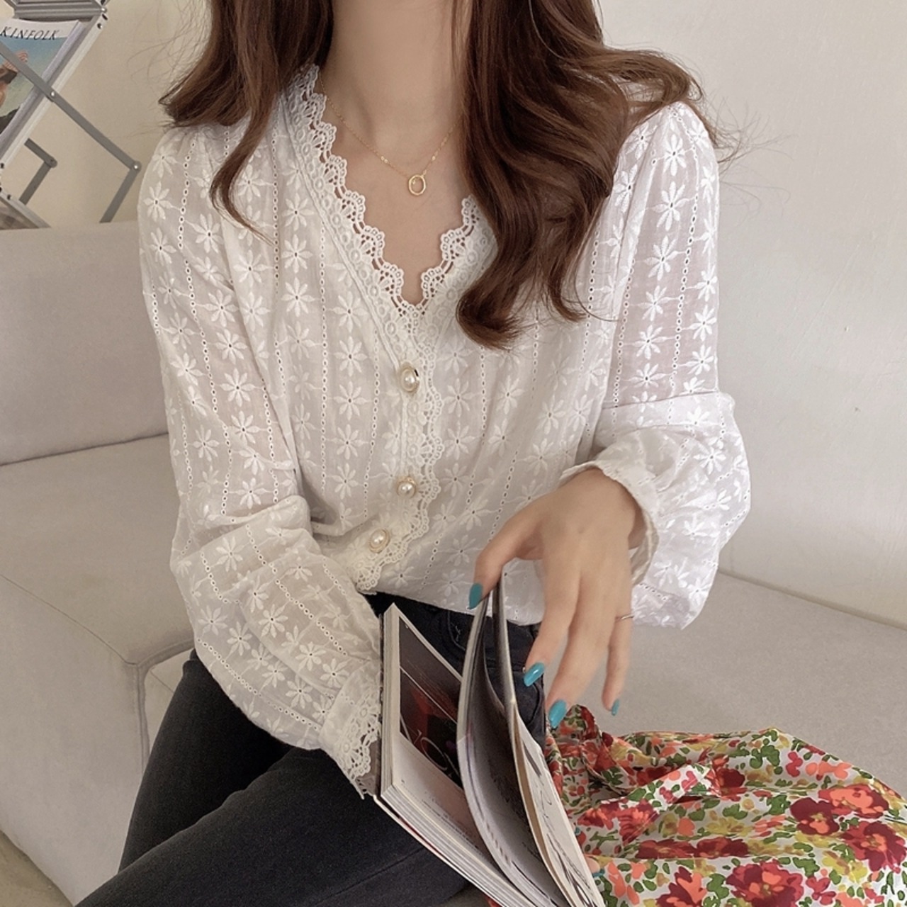 襟元や袖口のレース使いがとてもオシャレです!