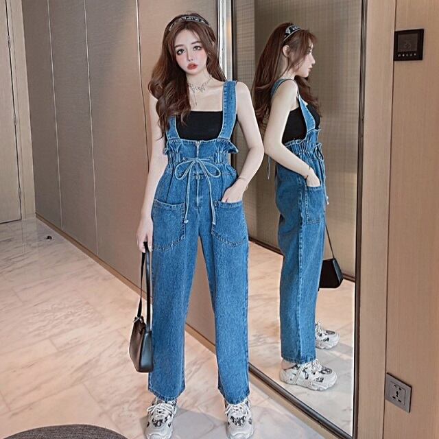 《入荷待ち》全2色 デニム デニムサロペット レディース オールインワン ワイドパンツ レディス サロペット オーバーオール ジーンズ ストラップデニムパンツ ウエストマーク リボン スリム キレセク
