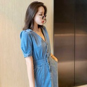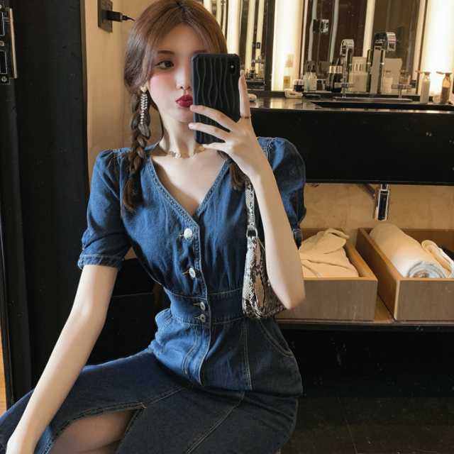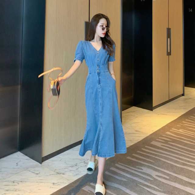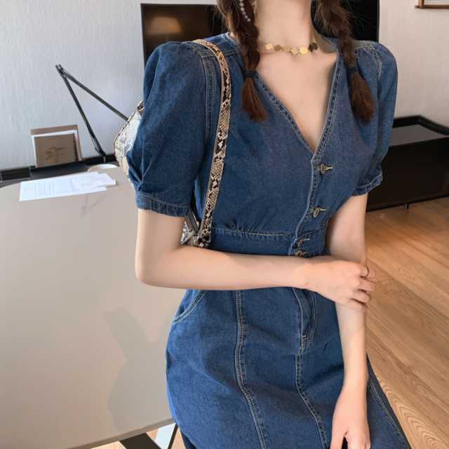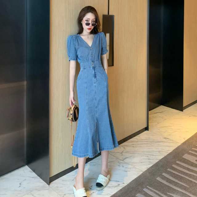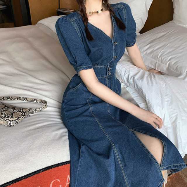 《入荷待ち》全2色 デニムワンピース デニムスカート ワンピース デニム マーメード風 ワンピース ミディアム丈 ひざ下丈 パフスリーブ Vネック きれいめ キュート エレガントスタイル ハイウエスト レディース キレセク