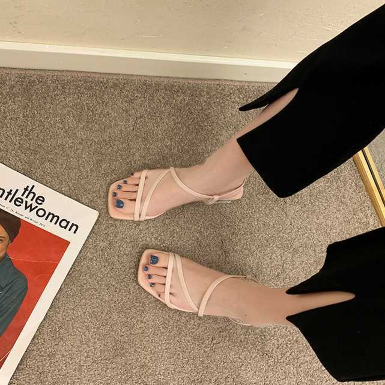 細目のストラップで足元を華奢に細く魅せる効果あり。