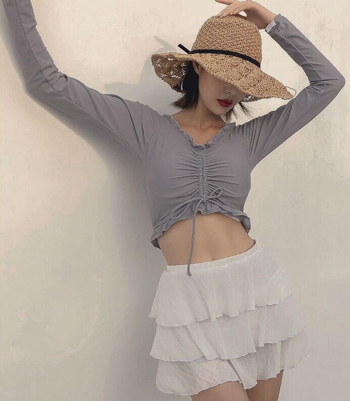 全2色 大きいサイズ 小さいサイズ ビキニ 水着 ツーピース ラッシュガード シャーリング ティアード 長袖 シンプル フェミニン 体型カバー 海 ビーチ プール 海水浴 リゾート ママ 水20 水30 水40