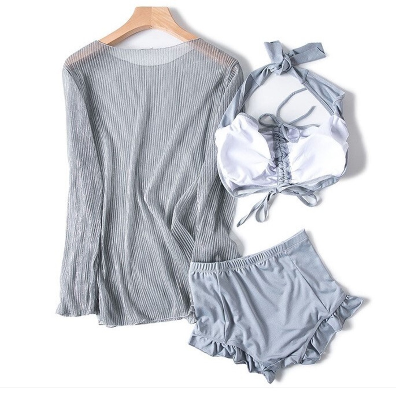 全4色 大きいサイズ 小さいサイズ 水着 ビキニ 3点セット シャーリング フリル シアー 長袖 シンプル フェミニン 体型カバー 海 ビーチ プール 海水浴 リゾート ママ セット 水20 水30 水40