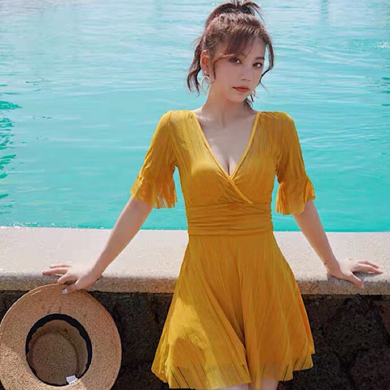 ざっくりと開いたVネックがちょっぴりセクシーな水着です。