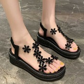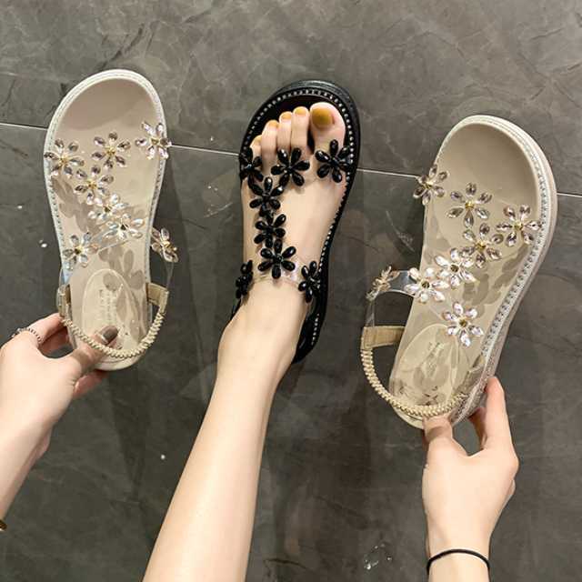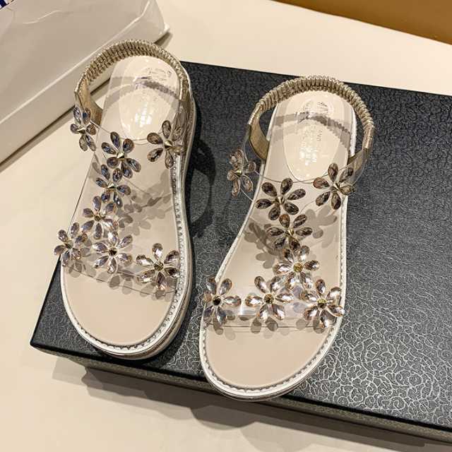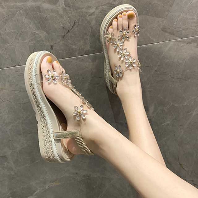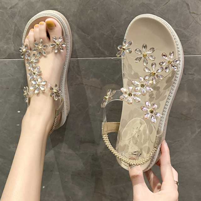 フラワーモチーフのビジューが華やかで愛らしいウェッジソールサンダル♪
