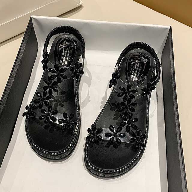 クリア素材にビジューを施しているので、足元に花が咲いたようなとても見栄えのするデザインが魅力的。