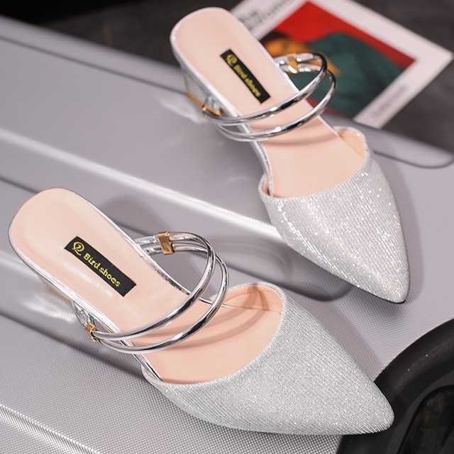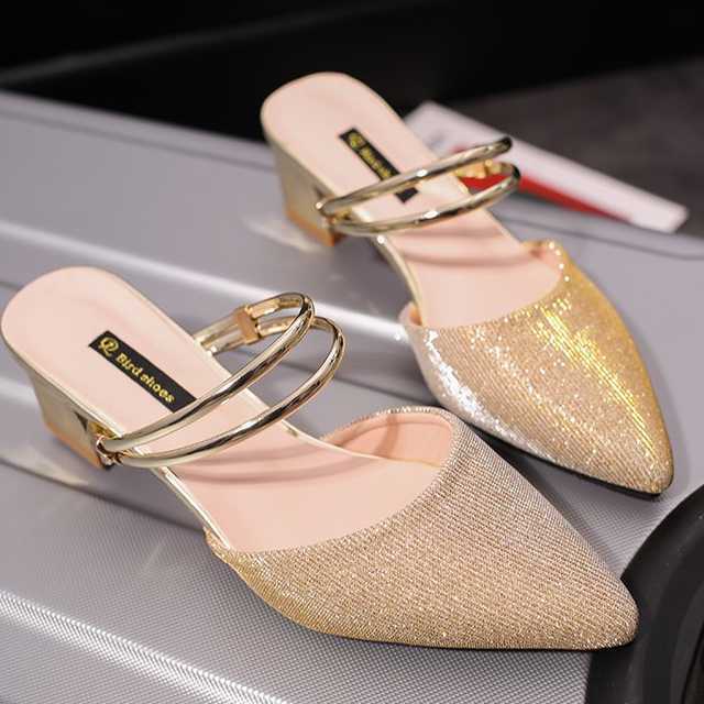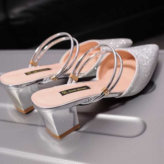《入荷待ち》全2色 ミュール レディース 中ヒール ポインテッドシューズ 太ヒール ピンヒール サンダル とんがり スパンコール ラメ キレセク