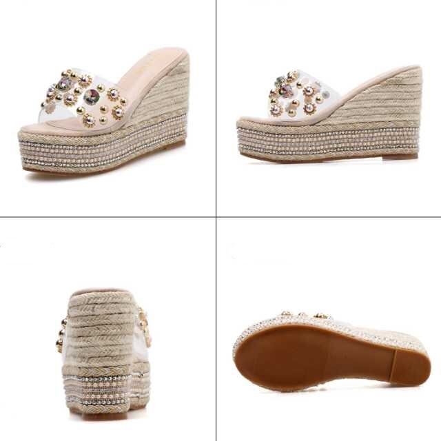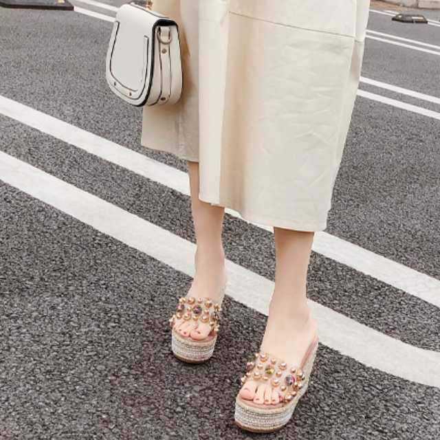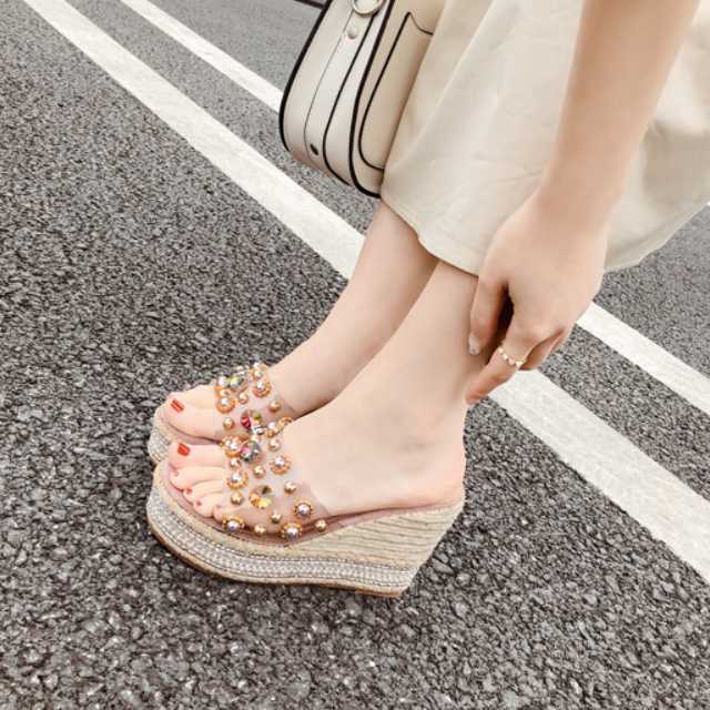 《入荷待ち》全2色 サンダル ウエッジソール 前厚 厚底 ビジュー ヒール レディース靴 サンダル ミュール 春夏 厚底ウェッジ 靴 レディース ジュートラップ オーペントゥ オシャレ ビーチサンダル キレセク