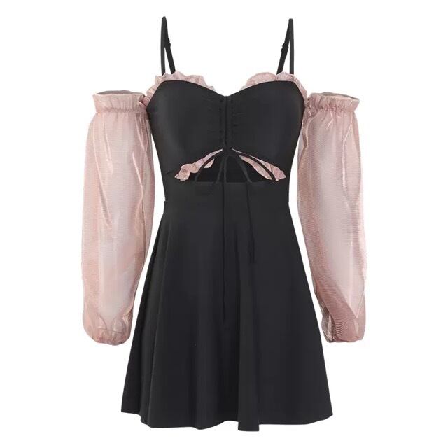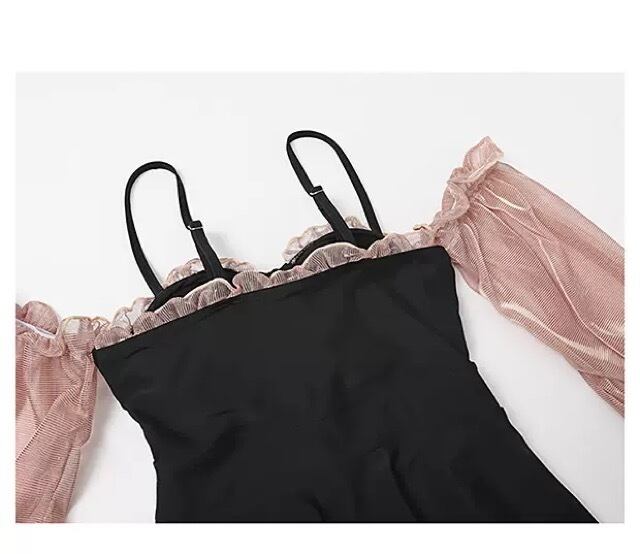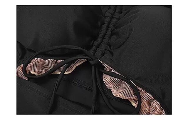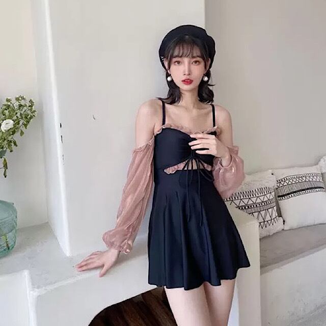 《入荷待ち》無地 フロントリボン ギャザー ミニ丈 ショート丈 オープンショルダー フレンチパフスリーブ ワンピース水着